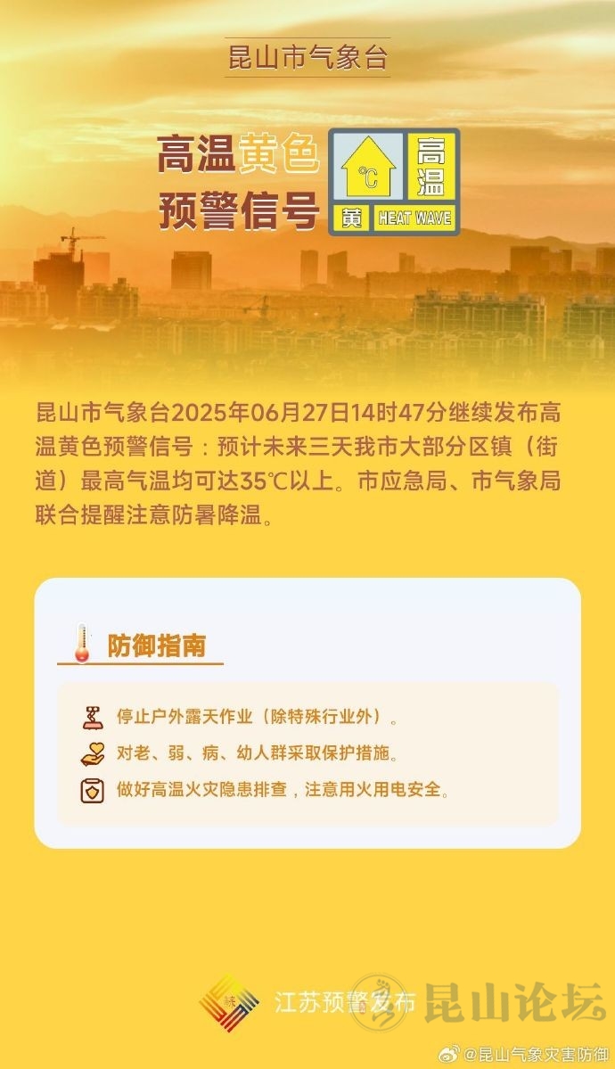 昆山市气象台2025年06月27日14时47分继续发布高温黄色预警信号:预计未来三天我市大部分区镇(街道)最高气温均可达35℃以上。市应急局、市气象局联合提醒注意防暑降温。