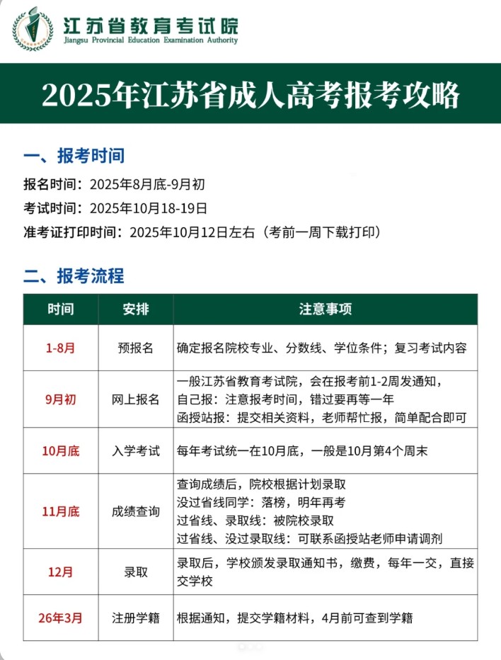 25年江苏成考已经进入到预报茗阶段了❗️❗️还没搞懂江苏成人高考是什么❓怎么报❓可以自己报,也可以找官方函授站报❗️📝报考流程1-8月——预报名9月初——正式网报💻10月底——统一入学考试📢11月底——成绩查询🔍12月——录取🎉26年3月——注册学籍❤️​​✅报考条件大专:1.年满18周岁 2.有高中或中专毕业证书本科:1.年满18周岁 2.学信网可查大专或本科学历成考学历,学信网终身可查,可考公考编等,一年仅有①次报考机会❤️