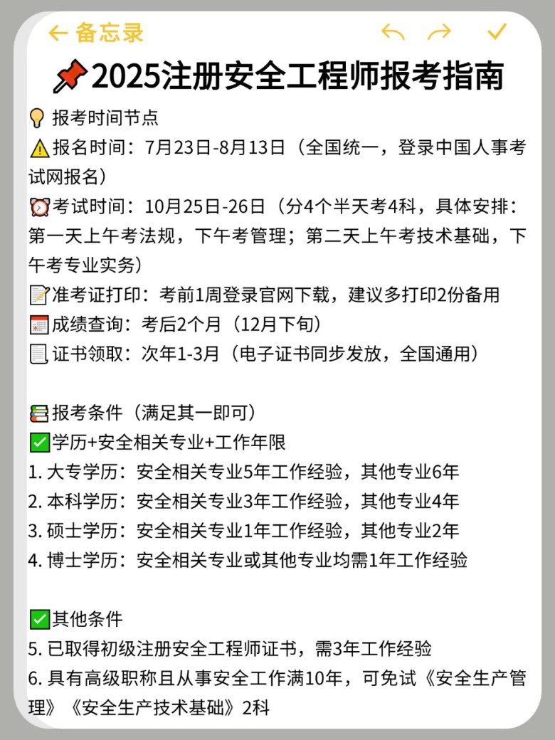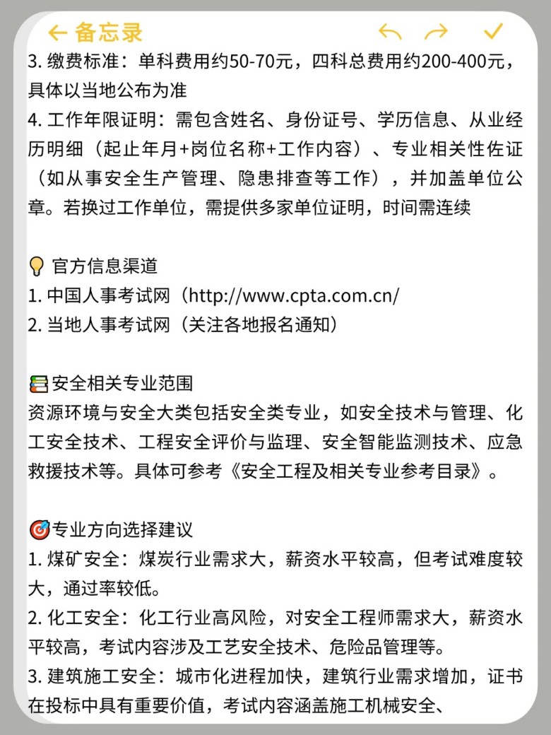 ▶️ 专业实务(7选1,案例占60%!) 方向:煤矿/金属矿山/化工/金属冶炼/建筑施工/道路运输/其他安全(不含消防)选专业技巧:优先选从业领域!比如建筑人→建筑施工安全(场景熟=好拿分)坑点:案例题要跨科!法规条文+管理流程+实务知识全得会(比如“事故分析=技术违规+法规责任+管理漏洞”)五、证书福利✅ 个税抵扣3600元/年(继续教育专项扣除)