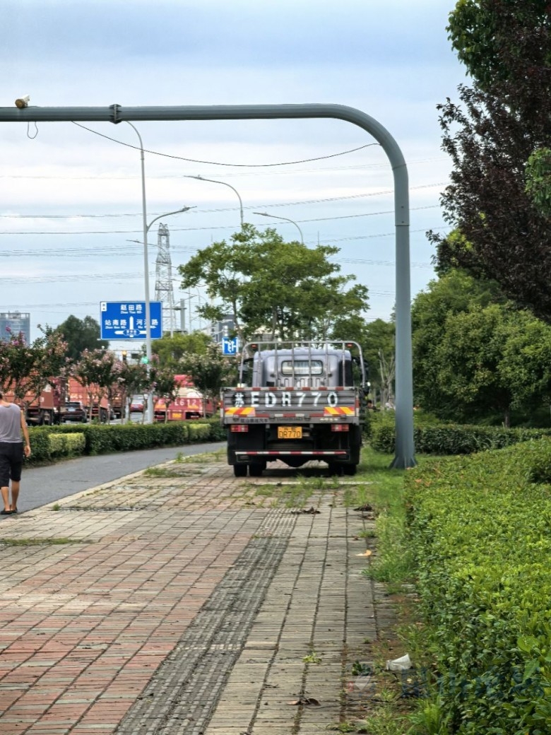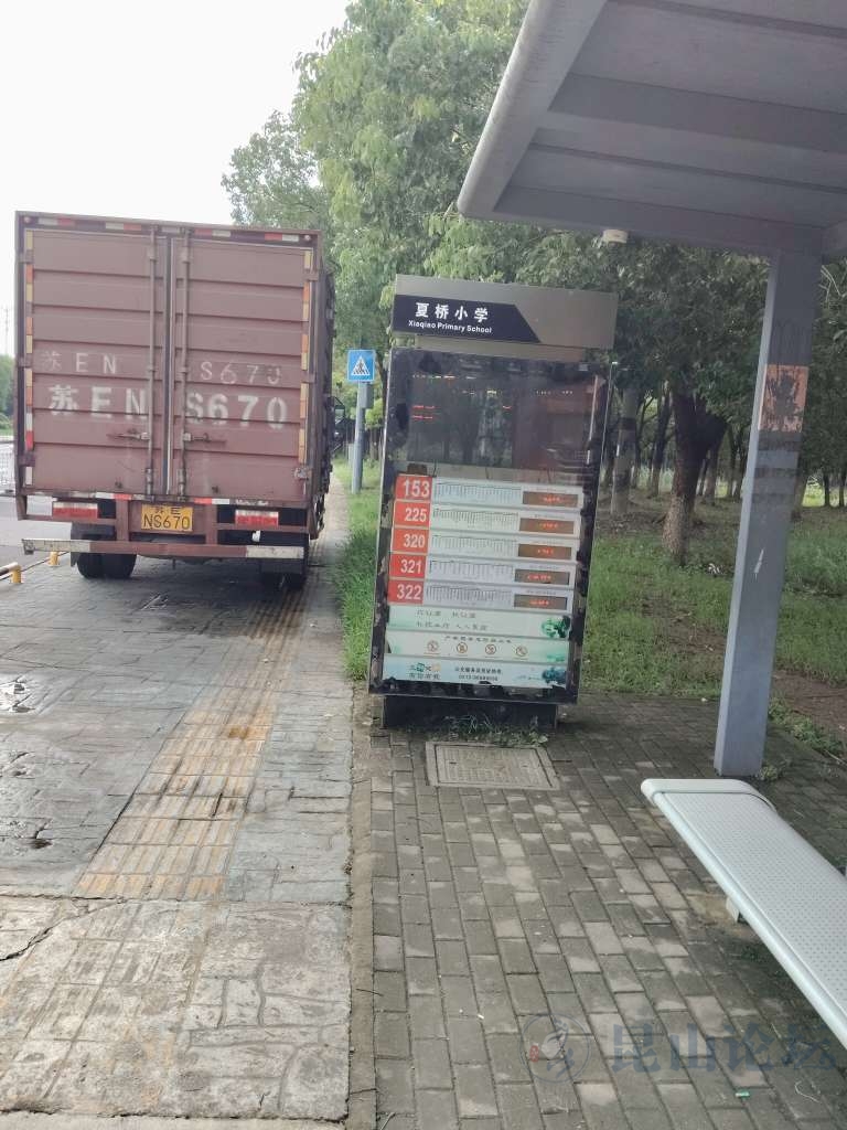 在昆山陆家镇河涌路夏桥公交站,看到两个大家伙,拖着笨重的身体,硬是给爬上了人行道,好家伙,还把一个小护栏压倒了。