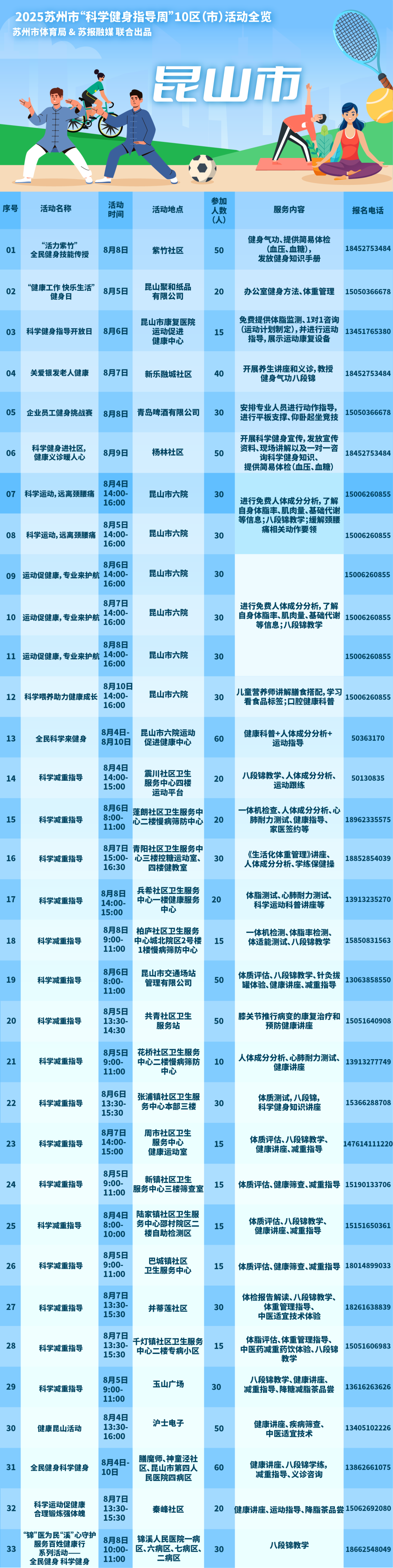 今年8月8日是我国第17个“全民健身日”,全市各地、各单位广泛开展群众身边的赛事活动、科学健身指导、全民健身志愿服务、国民体质监测、国家体育锻炼标准达标测验等活动,满足群众多元化体育健身需求,营造“全民健身日”良好氛围。