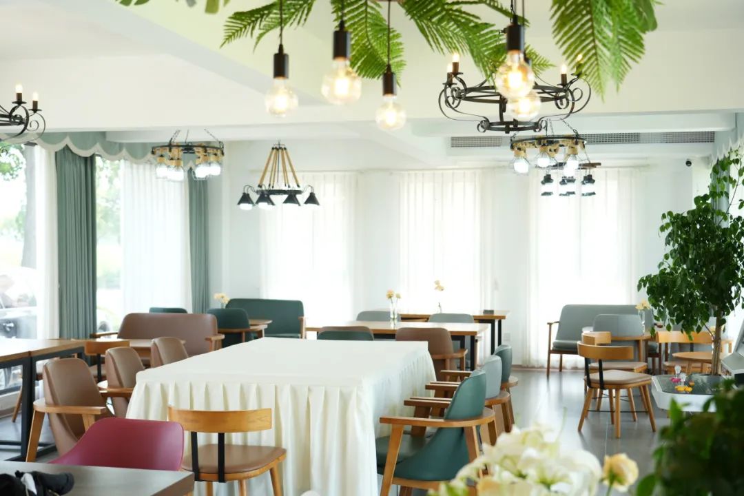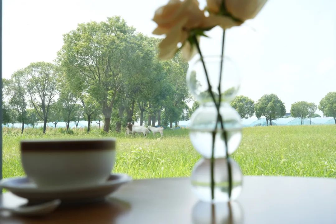 在菜篮子基地旁,还藏着一座治愈系咖啡馆。落地窗外,毛茸茸的小羊羔正悠闲踱步,当暮色渐染,整面落地窗便化作金色画框,将整个空间浸染成温柔梦境。