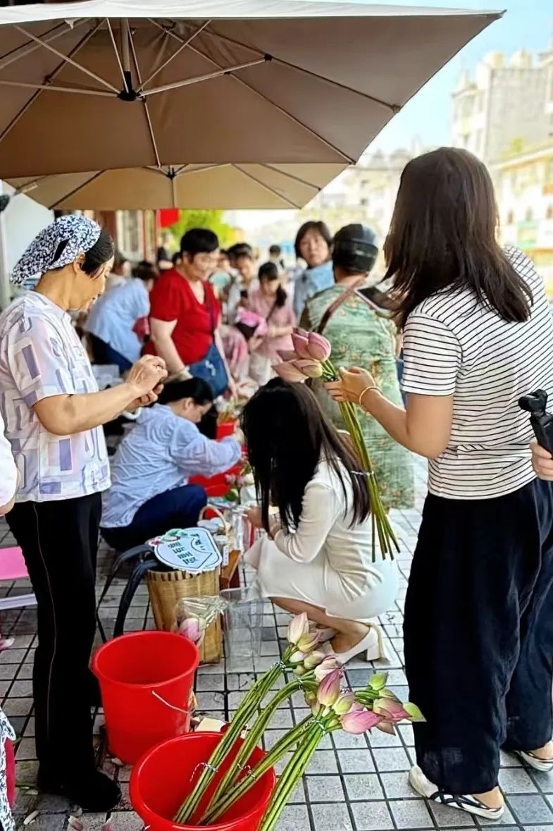 产业发展的红利,实实在在流进了百姓口袋。不少南渔村村民经过培训,熟练掌握了荷花采摘标准、田间管理等技能,实现了家门口就业。今年,随着昆山文体活动的火热开展,大量外地游客涌入,南渔村抓住机遇,在奥灶馆门口摆起荷花市集。10多位60岁左右的村民成为“银发销售员”,他们热情的服务和实惠的价格,让荷花市集备受追捧,单日最高销售额突破5000元。上海、苏州等地的生鲜订单接踵而至,昔日不起眼的荷花莲蓬,成了村民手中的“致富花”“金莲子”。“村里还为村民开设服务礼仪、摄影直播等培训课程,如今这些阿姨们都成了小有名气的‘网红’。”南渔村党支部书记陆雅妮说道。
