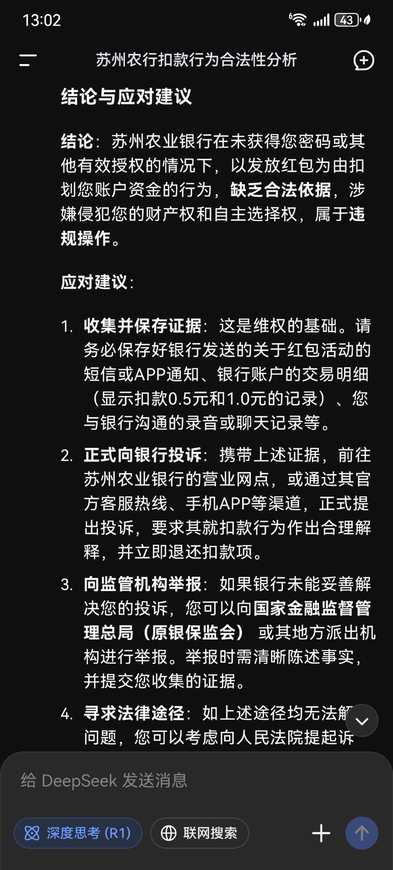 我说,你们没有经过我同意就扣我钱,这是违规,必须按照我的诉求赔偿。