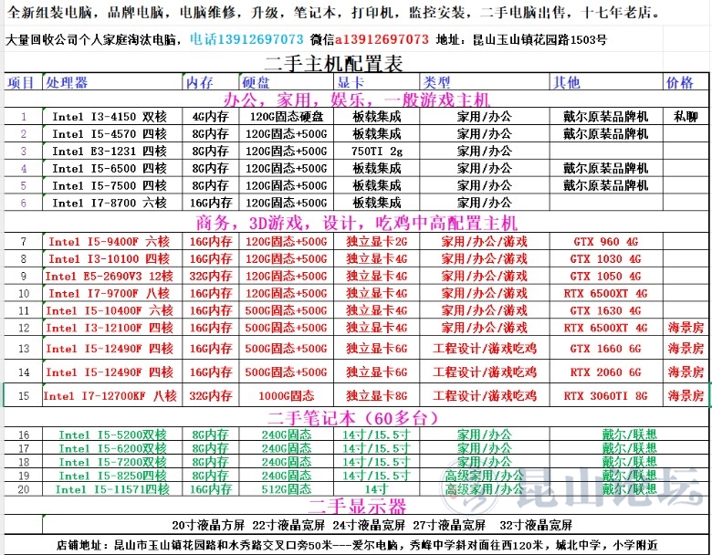 本小店尚有100多台精品二手电脑,二手笔记本60多台,二手台式机40多台。笔记本主要用来办公和看图或者孩子网课以及编程学习,部分台式机还可以玩大型游戏和做3D设计和直播。所有电脑均可以出售,也可以出租,有需要的个人和公司,请联系我,量大优惠力度更大。