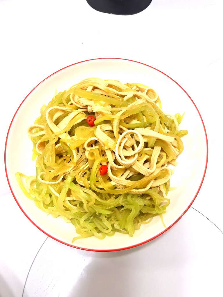 千张切丝焯水,放凉水盛起备用,莴笋切丝放盐半勺,白砂糖2勺,腌制15分钟-20分钟,杀出水,千张丝和莴笋丝充分搅拌,放盐,鸡精,香油,装盘