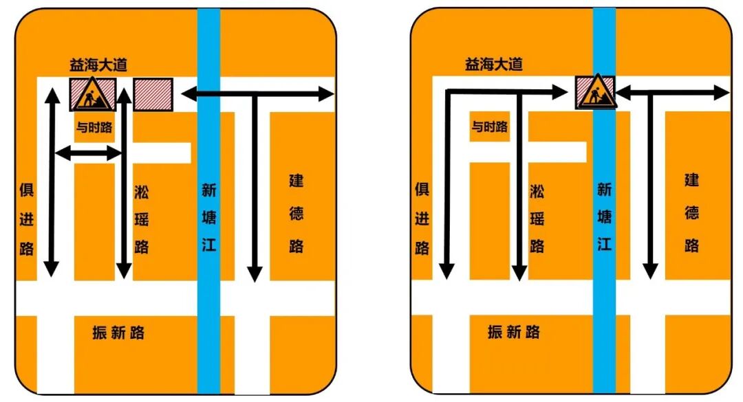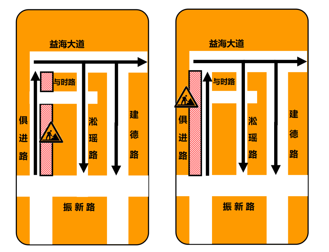 为改善市民交通出行,2025年10月09日至2026年08月09日俱进路(振新路-益海大道)、益海大道(俱进路-新塘江)路段将进行改造施工。施工期间请过往车辆及行人按照交通指示进行绕行。