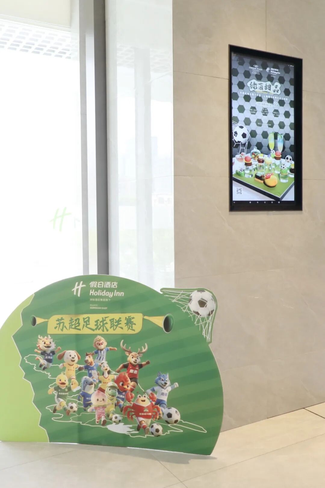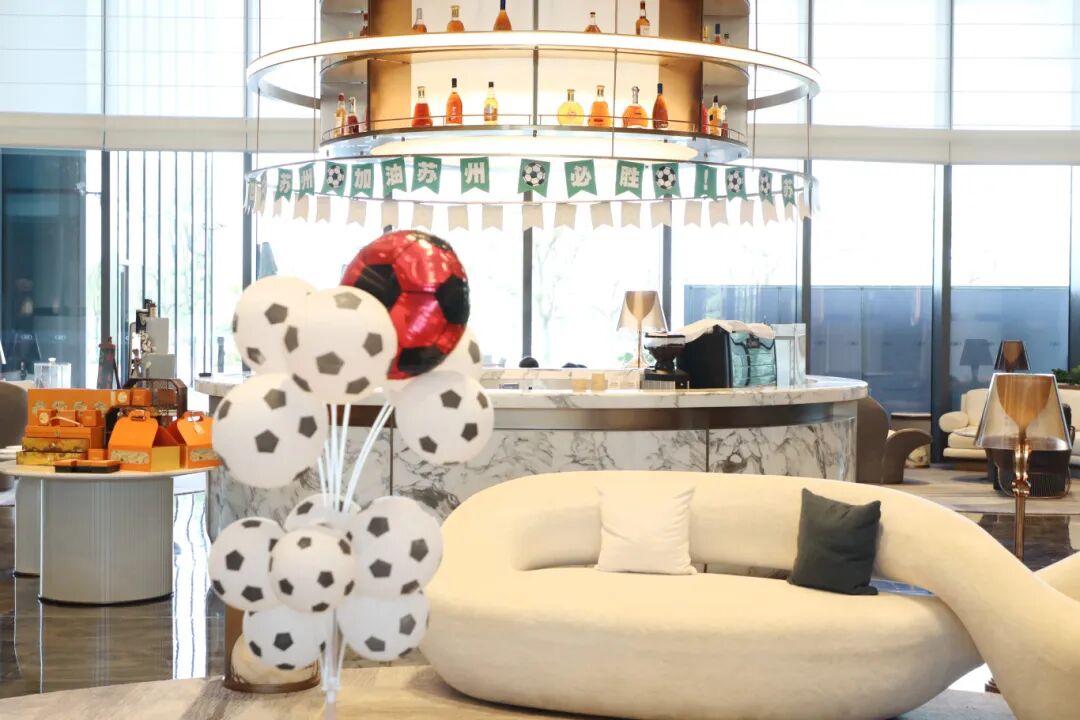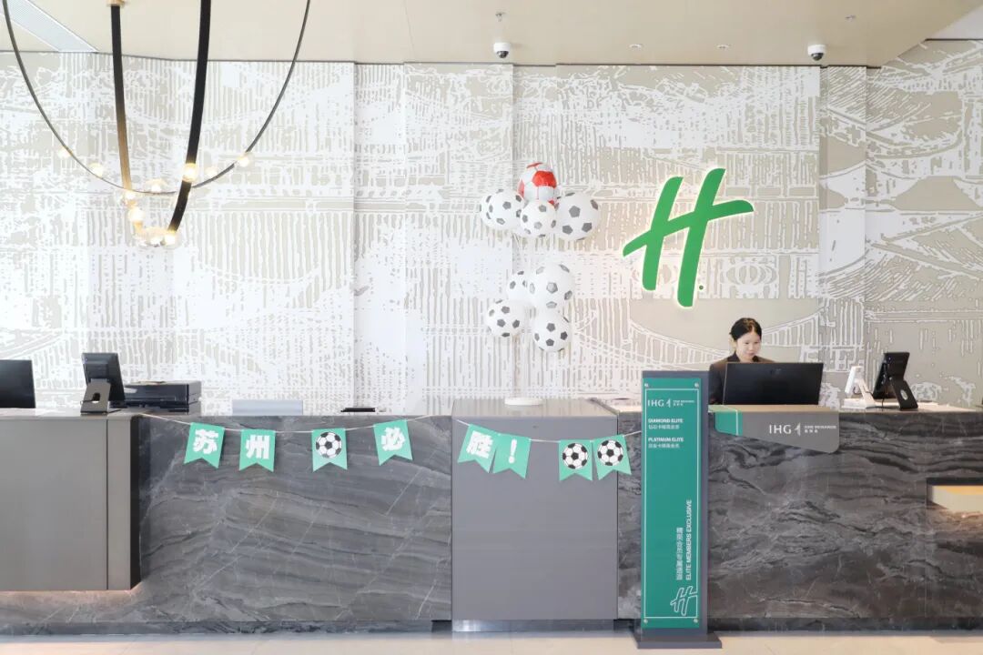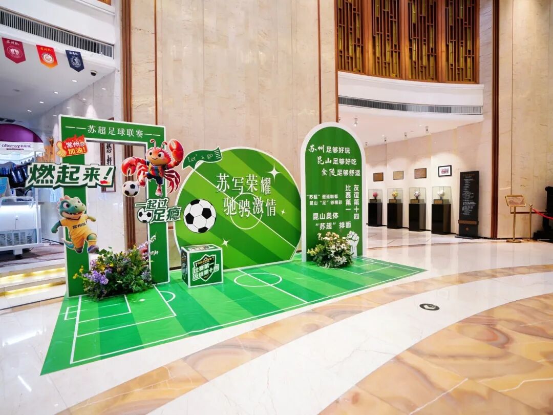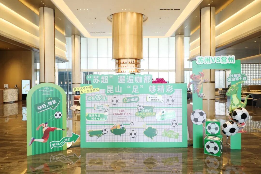 作为本场苏州队的大本营,昆山时代皇冠假日&假日酒店从外到内都被足球元素所点缀。步入酒店大堂,“苏超”主题相关的背景墙格外吸睛,订制助威展板上写满各类加油助威口号。酒店户外区、外摆区同样以足球主题元素进行装点,营造出浓浓的赛事氛围。