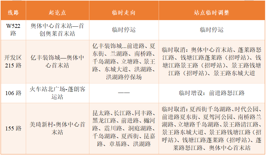 赛事期间奥体中心周边道路管控,W522路、155路、开发区215路于道路管控期间线路临时调整(具体管制及调整时间以现场为准),同时增设106路临时站点。