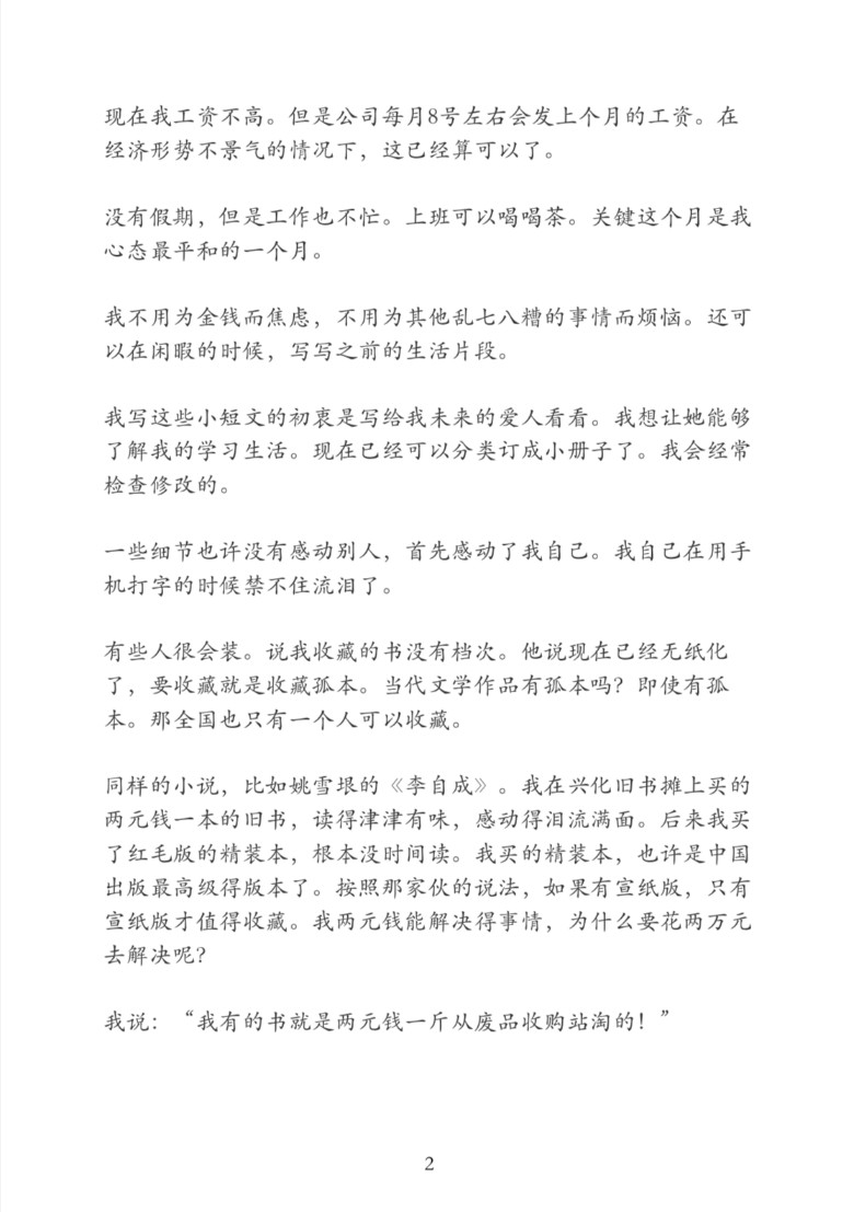 在关于书籍收藏的讨论中,作者鲜明地表达了对虚荣收藏观的不屑。以《李、自成》为例,旧书摊两元一本的版本能让他读得津津有味、感动落泪,而高价精装本却被束之高阁。这对比深刻揭示出,书籍的价值不在于版本多珍稀、价格多昂贵,而在于能否给人带来精神上的触动与享受。作者 “两元钱一斤从废品收购站淘书” 的表述,更是带着一种对质朴阅读与收藏的骄傲,彰显出不慕虚华、只求本真的生活与阅读态度,也引发读者思考,在物质丰富的当下,如何坚守内心的纯粹与对事物本质的追求。