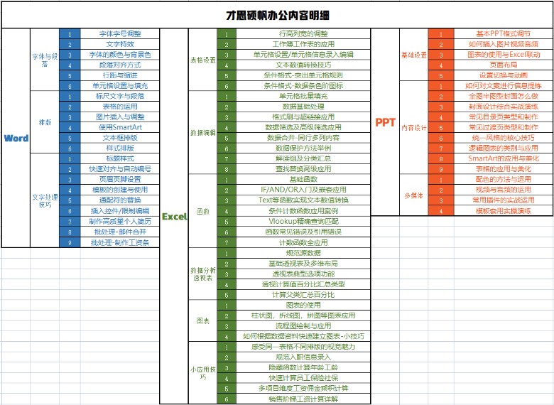 Excel:学表格制作、编辑与排版、数据运算、统计的使用及打印输出...PPT:学幻灯片的新建、制作、设计及播放设置等
