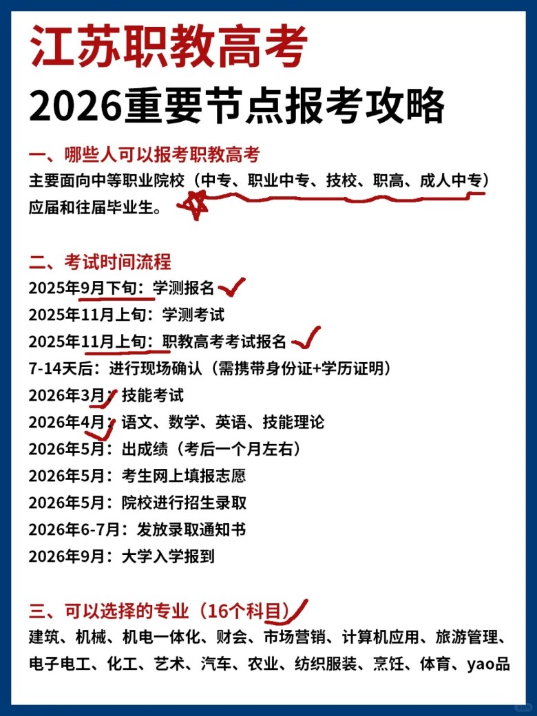 2026江苏职教高考时间节点和报考攻略🚩职教高考报考对象:主要面向中等职业院校(中专、职业中专、技校、职高、成人中专)应届和往届毕业生。🚩考试时间流程2025年9月下旬:学测报名2025年11月上旬:学测考试2025年11月上旬:职教高考考试报名7-14天后:进行现场确认(需携带身份证+学历证明)2026年3月:技能考试2026年4月:语文、数学、英语、技能理论2026年5月:出成绩(考后一个月左右)2026年5月:考生网上填报志愿2026年5月:院校进行招生录取2026年6-7月:发放录取通知书2026年9月:大学入学报到🚩可以选择的专业(16个科目)建筑、机械、机电一体化、财会、市场营销、计算机应用、旅游管理、电子电工、化工、艺术、汽车、农业、纺织服装、烹饪、体育、yao品。