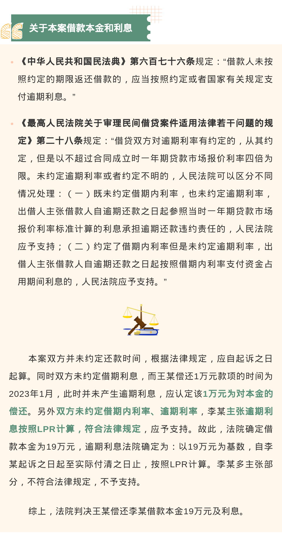 《中华人民共和国民法典》第六百七十五条规定:“借款人应当按照约定的期限返还借款。对借款期限没有约定或者约定不明确,依据本法第五百一十条的规定仍不能确定的,借款人可以随时返还;贷款人可以催告借款人在合理期限内返还。”本案双方虽未明确约定借款期限,但结合本案借款金额、交易习惯等,现李某以起诉方式要求王某偿还借款,应予支持。