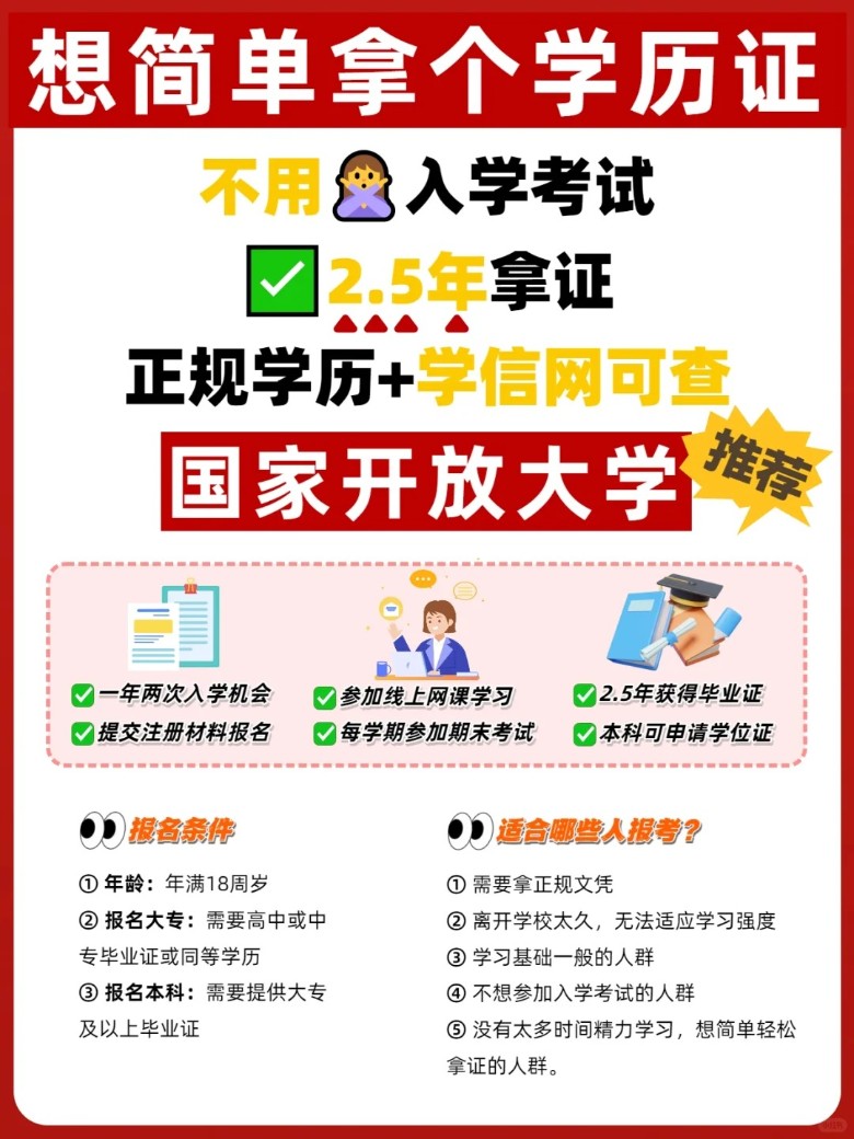 成考未过/想学历提升的同学看过来啦!国家开放大学2026年春季班攻略来咯! 🚨和成考学习周期一样长+学习方式灵活+国家认证,有想法的同学赶紧冲!🏫国家开放大学📖教育部直属公办高校,前身为中央广播电视大学,实行线上教学模式,学历证书全国通用,学信网终身可查。📄报名须知✅年满17周岁✅报专科需高中/中专学历✅报本科需学信网可查专科文凭 ⏰报读时间轴🔹2026年3月前:在教学点确认专业方向;🔹2026年3月:提交报名材料办理入学;🔹2026年4月:学信网学籍可查;🔹2026年6月-2028年6月:完成课程学习及期末考核;🔹2028年7月:毕业信息采集;🔹2028年9月:本科论文/专科实践报告;🔹2028年12月:生成学历证书编号;🔹2029年1月:领取毕业证书。 🎓学习方式✅线上授课→专本科均2.5年学制→审核式入学+过程性考核。🎓核心优势✅无需参加入学考试→提交资料即可注册入学;✅学习弹性化→工作学习两不误;✅毕业有保障→固定2.5年学制→按时完成即可毕业; 💁🏻♀️2026年春季招生通道即将开启!同学们抓紧机会!任何不懂的欢迎评论区留言💌咨询老师~