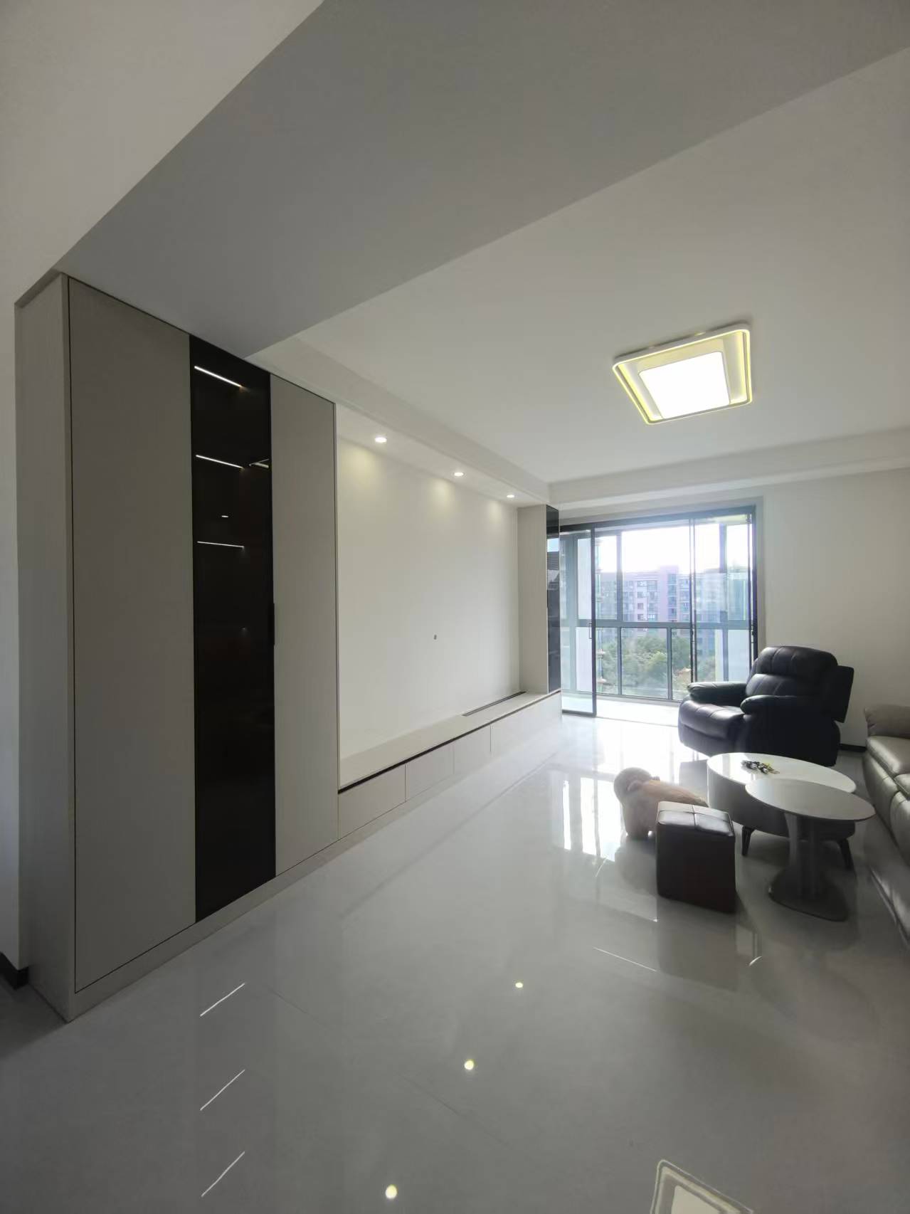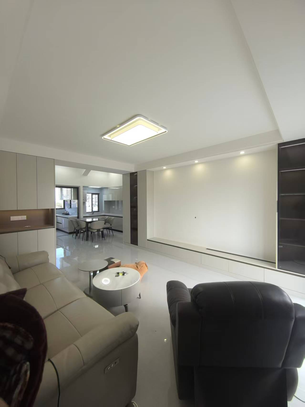 整个公共区通铺亮面浅灰地砖,视觉直接放大 10㎡,电视墙不做复杂造型,底部抽屉 + 左右两侧展示柜,杂物藏起来、摆件露出来,沙发旁做了整面收纳柜,一黑一白皮质沙发搭圆形细脚茶几,简约又有质感。