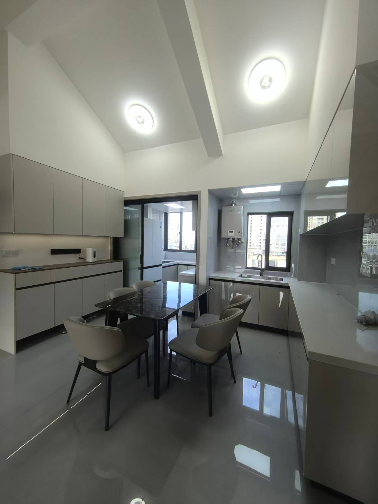 餐厅就在厨房外,传菜不用绕路太省心啦!挑了深色岩板桌面 + 细黑金属腿的餐桌,耐脏又不压空间,搭配浅灰皮质餐椅,刚好容下一家老小聚餐,椅子收进桌下时,过道还能留出足够的通行空间。