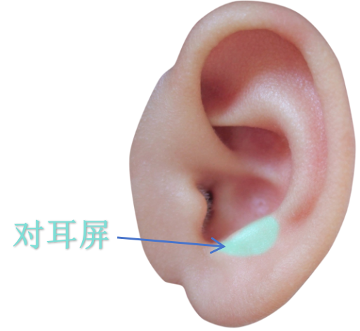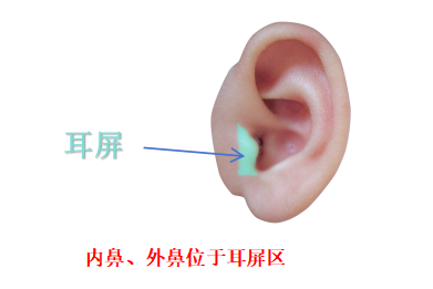 位置:耳孔前方的瓣状隆起(如“小耳朵”),内鼻在耳屏内侧面下1/2处,外鼻在耳屏外侧面中部。
