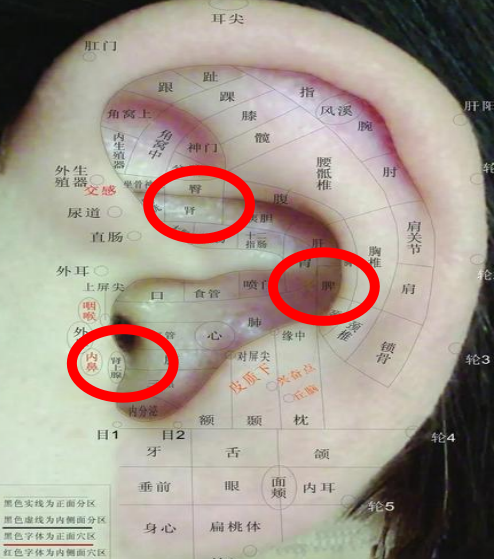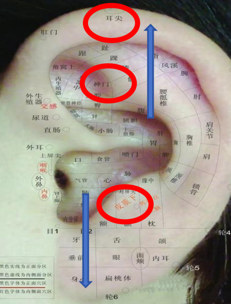 位置:耳尖在耳郭向前对折的上部尖端处,神门在三角窝后1/3的上部,皮质下在对耳屏内侧面。