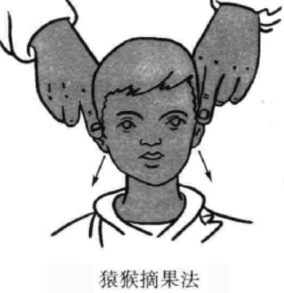 按摩方法:用拇指和食指夹住耳朵,从神门穴向上经耳尖穴上提8下,相当于古法按摩里的“猿猴摘果”手法;再以拇、食二指按摩两耳垂,食指抠到对耳屏内侧面,从皮质下开始向下扯8下。