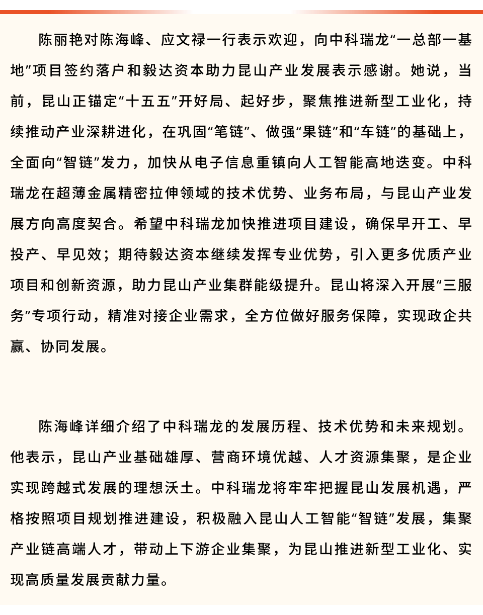 2月10日,中科瑞龙新材料项目签约仪式举行。市委书记陈丽艳,市委副书记、市长范建青会见了苏州中科瑞龙科技有限公司董事长陈海峰,毅达资本创始合伙人、董事长应文禄,共同见证项目签约。项目计划投资超30亿元,建成达产后营收超50亿元,进一步提升产业高端化、智能化、绿色化发展水平。市领导张峰、钱许东参加。