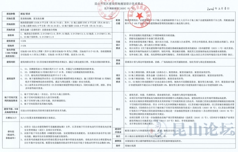 昆山市国有建设用地使用权 网上挂牌出让公告 昆地网[2026]商挂字2号 根据《中华人民共和国土地管理法》、《中华人民共和国城市房地产管理法》、《招标拍卖挂牌出让国有建设用地使用权规定》(国土资源部第39号)、《江苏省国有建设用地使用权网上交易规则》,经昆山市人民政府批准,由昆山市自然资源和规划局对以下地块组织进行公开网上挂牌出让。现将有关事宜公告如下:一、出让地块基本概况(地块具体详见特别说明)二、出让土地受让对象凡中华人民共和国境内外的法人和其他组织,除法律、法规和国家政策另有规定外,均可申请参加竞买。根据江苏省信用办《关于对国家下发的严重失信企业实施联合惩戒工作的通知》(苏信用办〔2016〕73号)要求,限制严重失信企业参加国有建设用地使用权挂牌竞价出让活动。三、出让土地有关事项(一)土地出让方式本次国有建设用地使用权网上挂牌出让采取在互联网上交易的方式进行,意向竞买人应持CA证书通过昆山市国有建设用地使用权网上交易系统(以下简称“网上交易系统”),参与网上挂牌出让竞买。竞买人请仔细阅读“网上交易系统”的“系统帮助”。CA证书办理地点在苏州市高新区长江路211号天都大厦北楼1310室(办理地点以官方实际公布为准,联系电话:400-025-1010、0512-68701110)。(二)土地出让流程1.公告:本出让公告发布时间为2026年2月13日至2026年3月5日。公告发布后,意向竞买人可通过网上交易系统下载网上挂牌出让文件。2.正式报名:公告期满后进入挂牌期。竞买申请人可于2026年3月6日9:00起至2026年3月16日下午16:00止持CA证书登录网上交易系统提交竞买申请,在网上交易系统确定的银行中选择一家银行按时足额缴纳竞买保证金。如竞买人持外币缴纳保证金,须与昆山市自然资源和规划局签订外汇保证金托管及结算协议,账户信息详见托管协议。具体联系:昆山市自然资源和规划局财务科0512-57376609。竞买人缴纳保证金到账后,网上交易系统自动赋予其取得竞买资格(保证金到账时间以网上交易系统接收银行反馈时间为准)。竞买人申请一经提交,即视为对挂牌文件及地块现状无异议并全部接受。3.自由报价:网上交易系统开通报价资格后,竞买人可进行自由报价,自由报价截止时间为2026年3月18日上午9:00。竞买报价所报价格必须高于最新挂牌价格,每次报价应在当前最高报价基础上递增1至5倍的加价幅度。网上交易系统报价一经确认后,不得变更或者撤销,允许多次报价。4.限时竞价:本次挂牌截止时间为2026年3月18日上午10:00。挂牌截止前一小时,停止更新挂牌价格,停止更新时最高报价作为限时竞价起报价。各地块在挂牌截止后进入限时竞价程序。如果2位及以上竞买人报名地块,无论竞买人在自由报价期间是否报价,均可参加限时竞价。限时竞价两次报价时间间隔不超过4分钟,若4分钟内无价格更新,报价最高者即为竞得人。5.成交通知与成交确认:网上挂牌出让成交后,网上交易系统自行向竞得人生成成交通知书。竞得人应在竞得之日起5个工作日内,持成交通知书、报名材料原件及有效证件原件、复印件提交出让人(昆山市自然资源和规划局)进行竞买资格审查。审查通过后,竞得人(法定代表人或授权委托人)须现场与出让人签订《国有建设用地使用权出让成交确认书》。对未取得国有建设用地使用权的竞买人的竞买保证金,在网上挂牌竞价结束后5个工作日内凭**申请退还,保证金不计利息。6.签订出让合同及监管协议:成交确认书签订后,竞得人须与属地政府签订《投资发展监管协议》。竞得人须在成交确认书签订之日起10个工作日内凭成交确认书等资料到与昆山市自然资源和规划局签订《国有建设用地使用权出让合同》。竞得人不按照规定时间签订出让合同的,市自然资源和规划局无条件没收竞买保证金,并取消成交资格。(三)特别说明:(包括建设要求、销售约定等)1.该项目须按照《市政府关于印发苏州市专项服务产业项目建设用地出让实施意见的通知》(苏府〔2011〕217号)文件要求执行,项目建成后不得销售,不得分割转让,可整体转让。2.竞得人须按照《昆山经济技术开发区建设用地规划设计技术要点》(昆开规新地设[2026]01号)要求执行。S1、S2地块主体功能限用于企业总部办公使用,商务金融(总部经济)计容建筑面积不低于总计容建筑面积的80%,地块内可设置配套商业、服务型公寓功能,其中,配套商业可建计容建筑面积不超过总计容建筑面积的10%,服务型公寓可建计容建筑面积不超过总计容建筑面积的10%。3.竞得人须按照规划条件要求开发利用地下空间作为地表配套使用的,与地表建设用地使用权一并取得,不计入地表容积率,地下规划功能为车库、配套设施用房、配套设备用房等。(四)其他要求本次出让地块所涉地下空间使用权设立及其各项规划管控要求的出具,均依据已经依法批准的详细规划中相应地下空间的开发利用内容,符合《中华人民共和国城乡规划法》、《城市居住区规划设计标准》(GB50180-2018)、《江苏省城乡规划条例》、《江苏省城市规划技术管理规定》、《省政府办公厅关于城市地下空间开发利用的指导意见》(苏政办发〔2020〕58号)、《江苏省自然资源厅党组关于严格执行国有建设用地出让规定进一步加强监管监督工作的意见》(苏自然资党组发〔2019〕94)等法律法规和技
