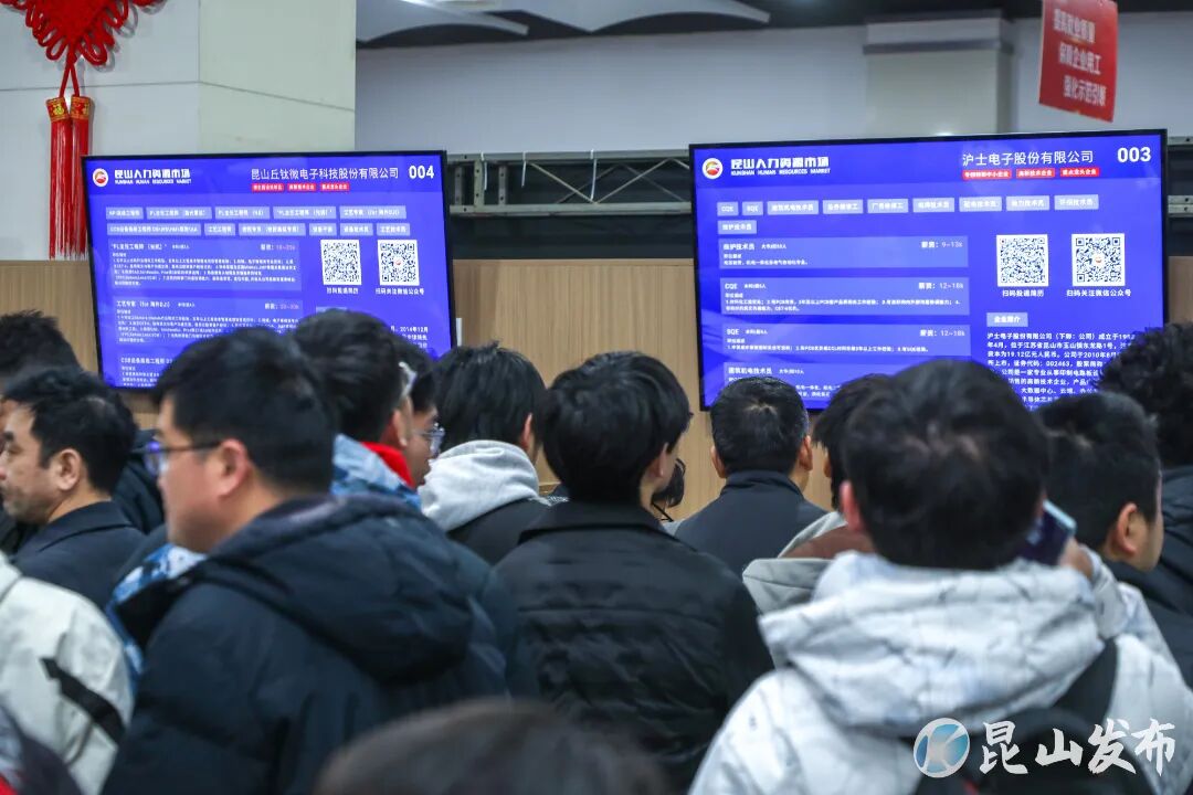 线下招聘现场盛况同样火热。在昆山人力资源市场广场上,不少求职者围聚在一幅巨型展板前,挑选着自己的理想岗位。走进一楼招聘大厅,用人单位尚未到齐,人力资源市场里已经涌入不少求职者,有人在和HR攀谈,有人在仔细研究屏幕上的岗位,超百家用人单位携6000余个优质岗位虚位以待。
