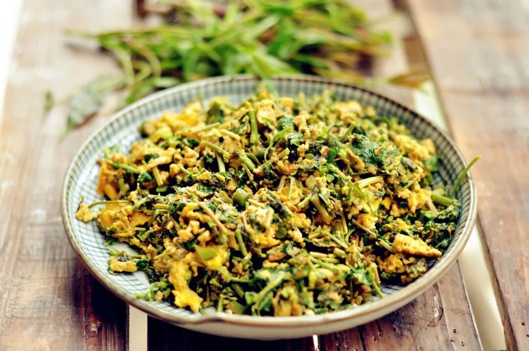 紫红的嫩芽切碎了炒蛋