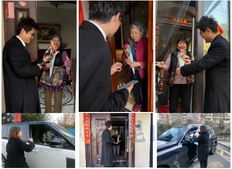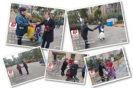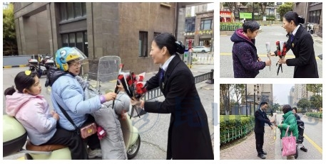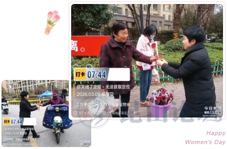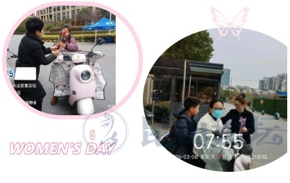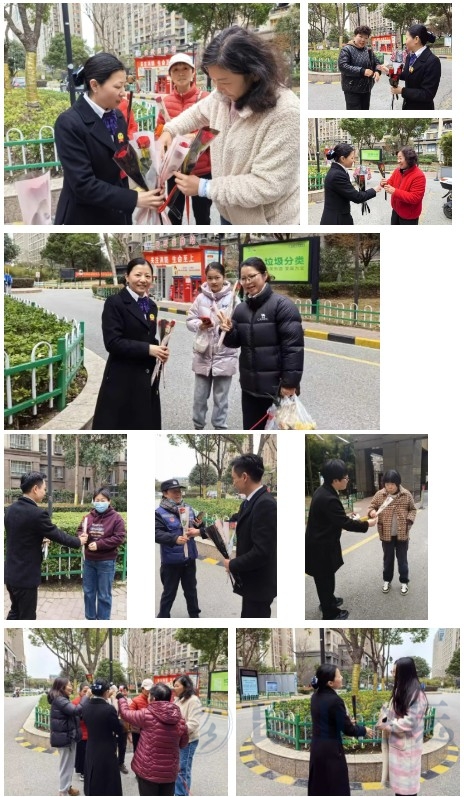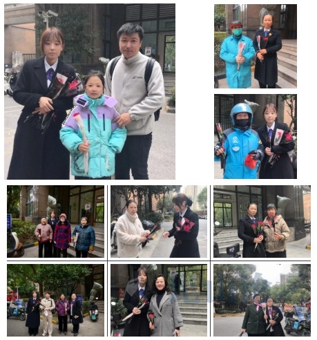 一大早,他们来到小区的西门、南门出入口,向往来的小区女性业主送上鲜花,并送上一句节日祝福:“祝您节日快乐!”