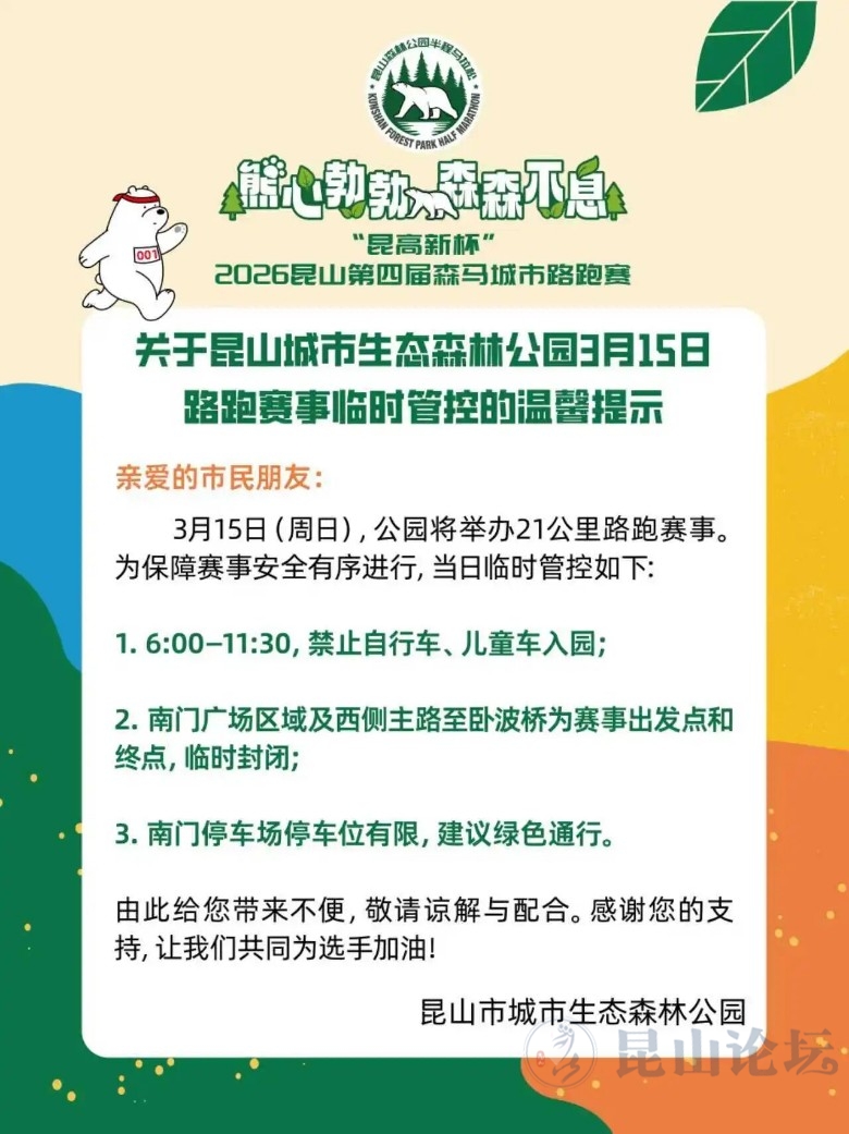 3月15日(周日),昆山城市生态森林公园将举办21公里路跑赛事。