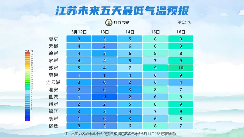 预计2026年3月21日~4月10日平均气温淮北地区和江淮之间较常年偏高0~1℃,苏南地区较常年偏高1~2℃。极端最低气温淮北地区-1 ~1℃,其他地区1~3℃。