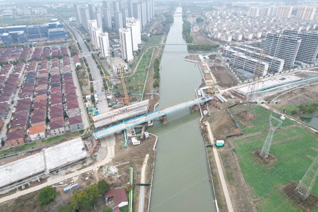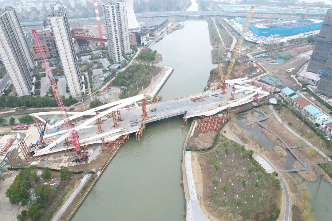 完成总体工程量64.2%。主桥下部结构完成100%,钢箱梁安装完成97.5%,拱肋安装完成50%;路基施工完成46%,路面施工完成29%。