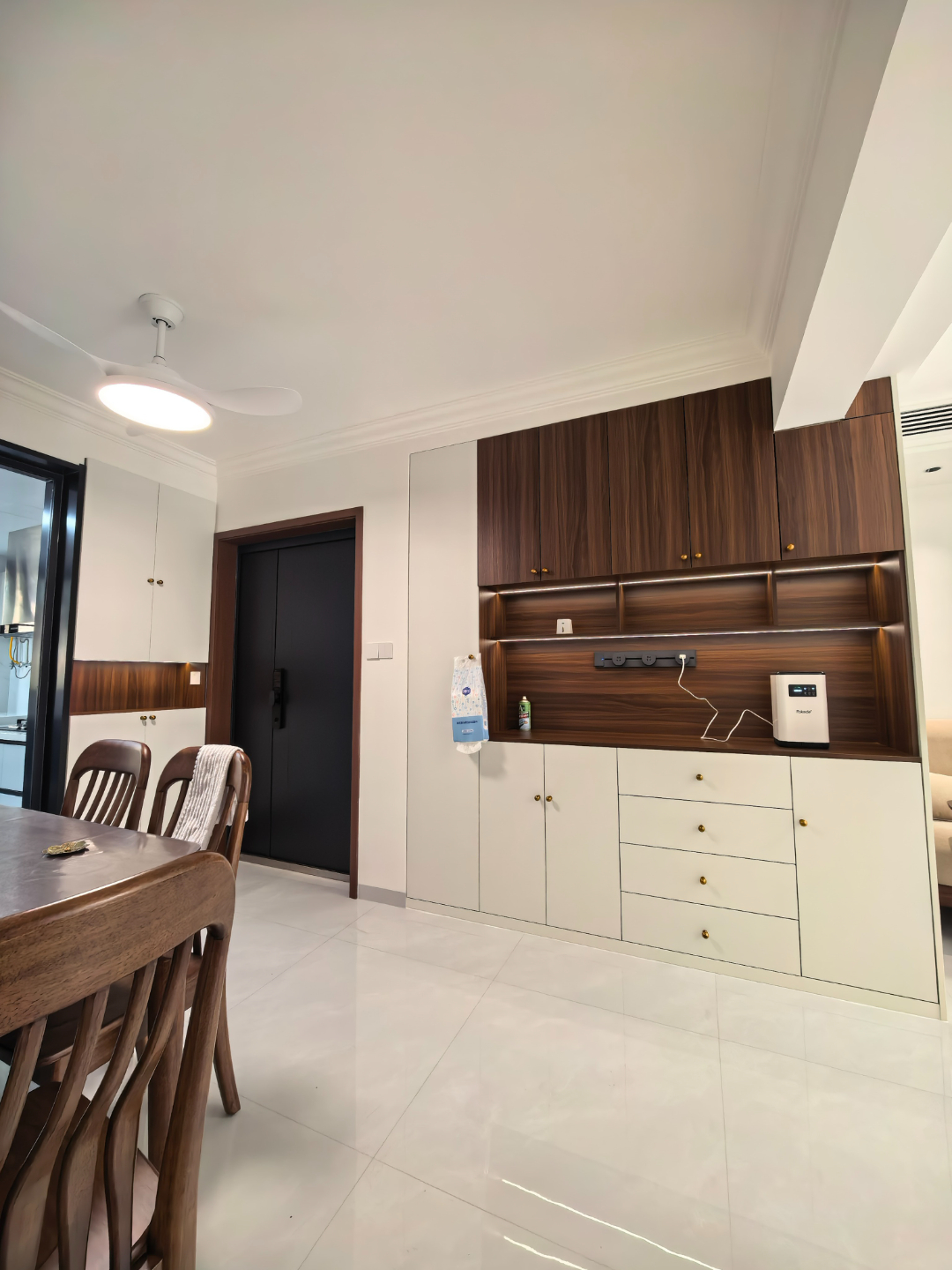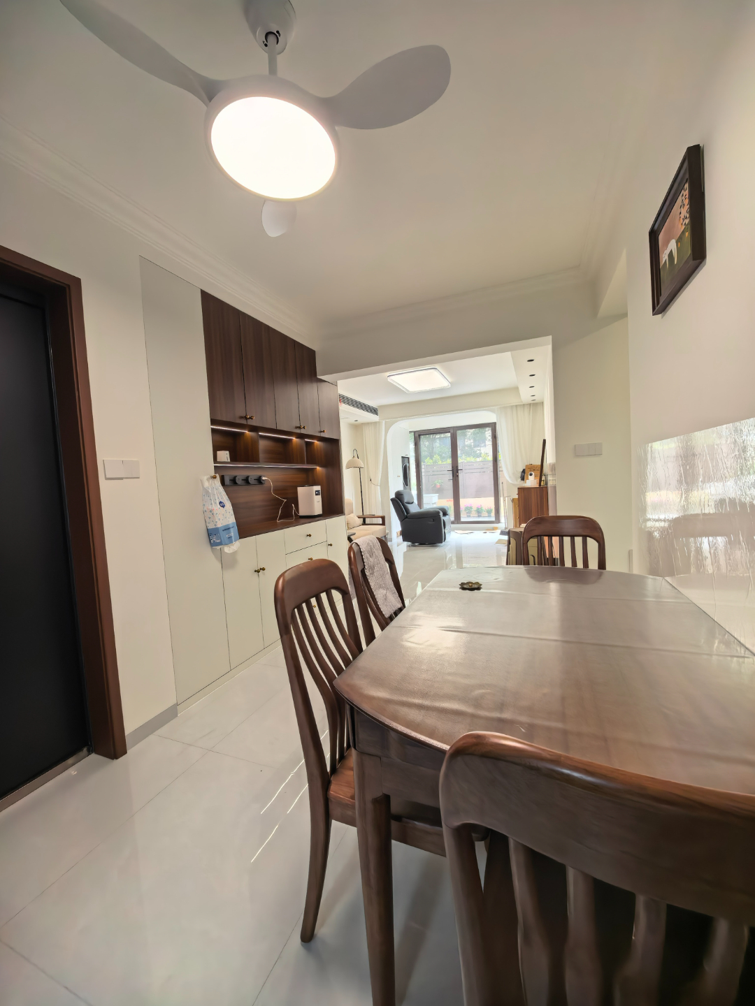延续玄关的白 + 深木色基调,餐厅区域显得格外温润实用。深木色餐桌椅靠墙摆放,既留出了宽敞的行走动线,也让小空间显得通透不拥挤,日常用餐、偶尔朋友小聚都足够从容。顶面的风扇灯设计太懂生活了,夏天送风凉爽,冬天照明柔和,颜值与实用性双在线。