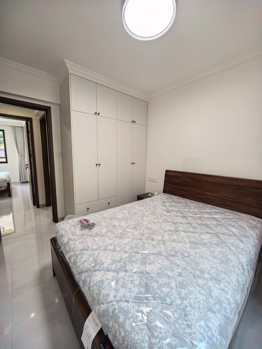 次卧深木色床头板显得沉稳大气,与整面墙的到顶白色衣柜形成经典撞色,视觉上明亮又不压抑。衣柜下方贴心设计了抽屉,方便分类收纳衣物、被褥等细碎物品,让小空间也能保持整洁利落。