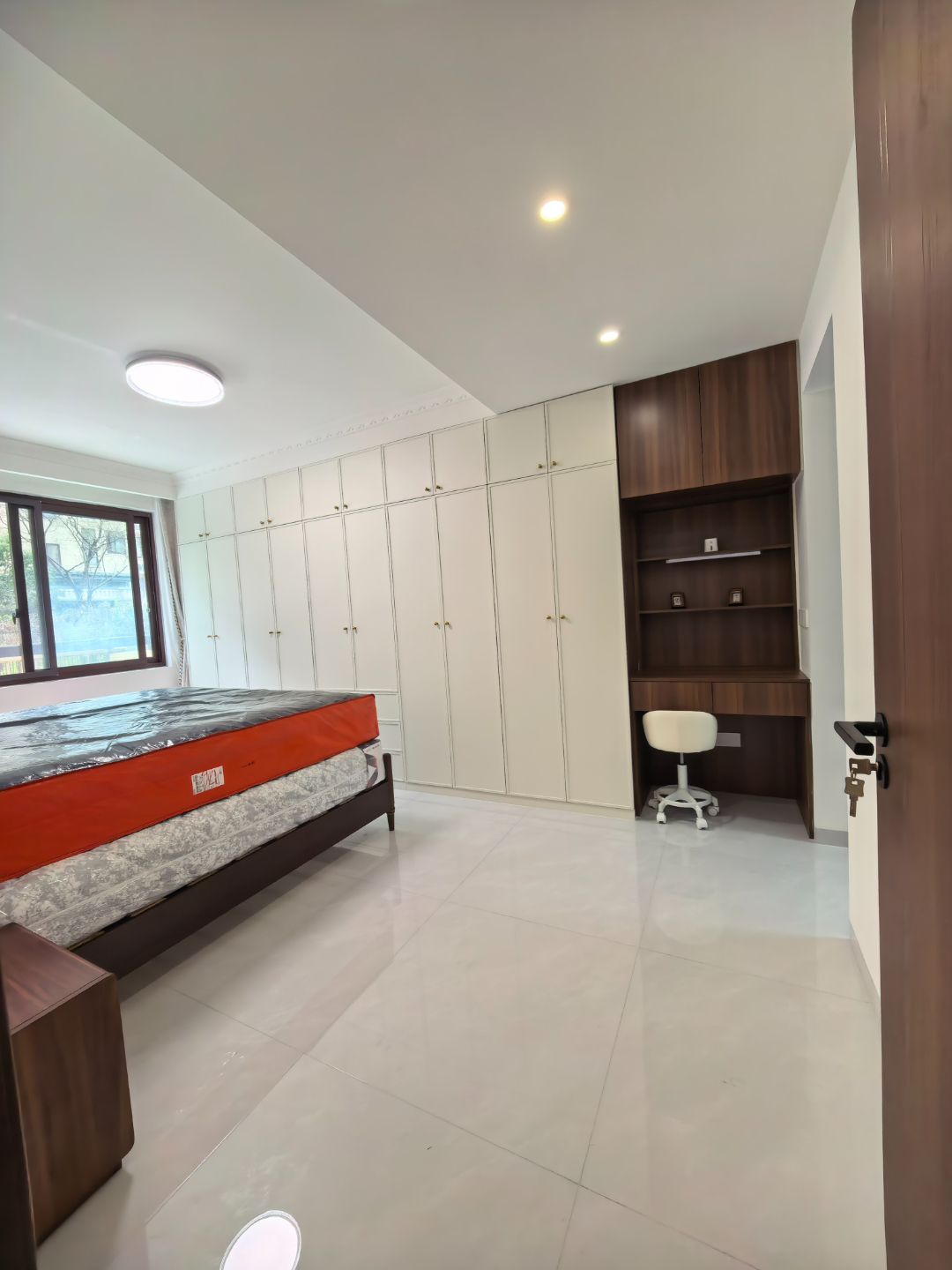 主卧空间宽敞通透,白墙 + 深木色的搭配延续了全屋温柔基调。床尾整排到顶衣柜,把衣物被褥统统藏起,让卧室更显整洁利落。旁边嵌入的书桌 + 开放格设计太实用了,既能满足日常办公、阅读需求,开放格也方便随手摆放书籍、摆件,收纳与颜值两不误。