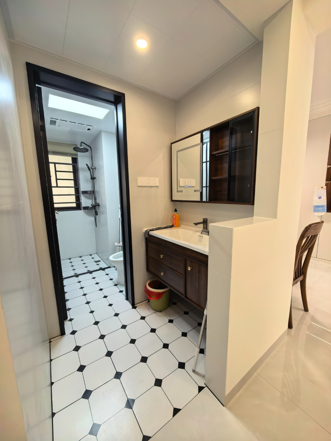 两个卫生间均采用三分离设计,干湿分区清晰,使用效率拉满。客卫的洗手池外,搭配半墙隔断,既不会遮挡采光,又能保证通风,让洗漱区和如厕、淋浴区互不干扰。深木色浴室柜 + 镜柜组合,收纳能力超强,瓶瓶罐罐都能藏得整整齐齐。