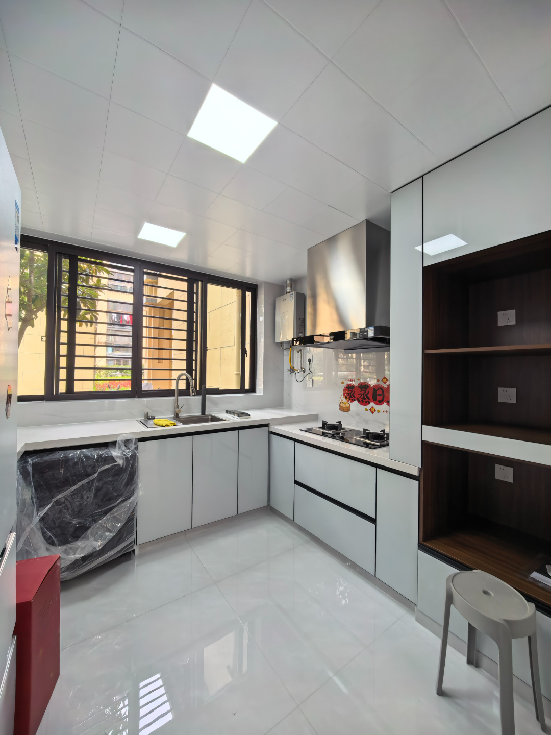 U 型布局的厨房,把动线和收纳都拉满了实用感。还有高低台的设计,实在太懂下厨人了,洗菜区稍高、烹饪区顺手,久站也不累;洗手池正对窗户,自然光充足,洗菜洗碗都明亮通透。柜门中间特意留空,未来可以嵌入小家电,让台面更整洁清爽。
