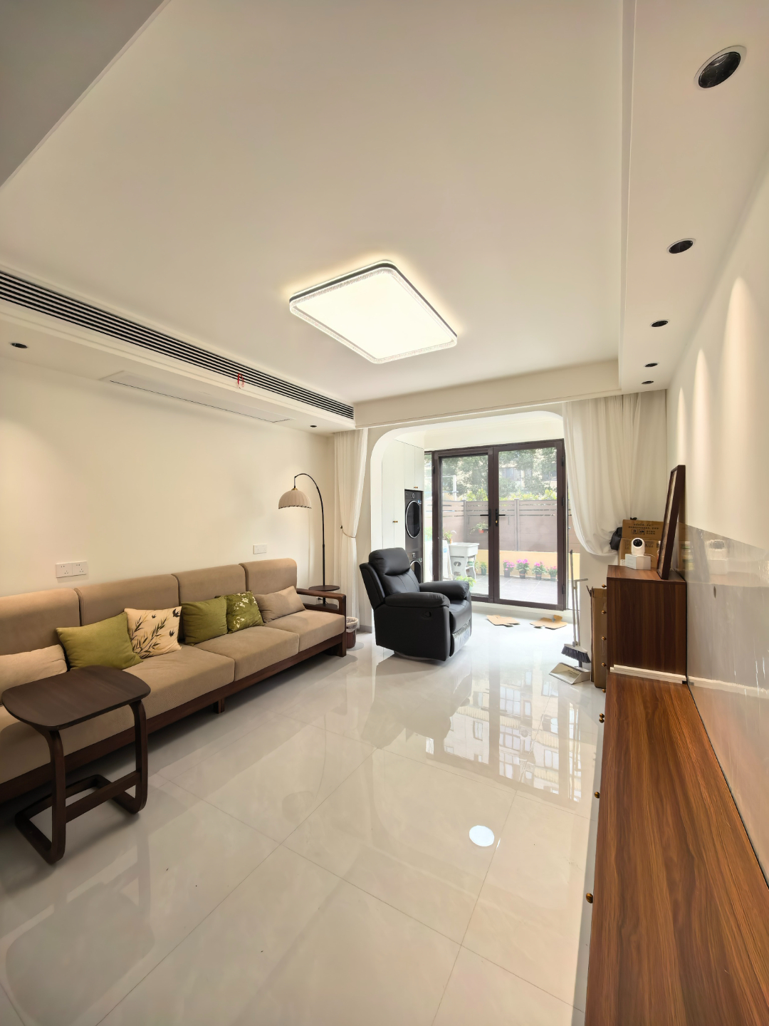 阳台与客厅连通,拱形门框柔化了空间线条,让整个家更显温润灵动。地面通铺灰色地砖,视觉上延伸了客厅尺度,通透感拉满。一侧定制了到顶的白色高柜,把洗烘一体机完美嵌入其中,既藏起了家电管线,又留出了充足的储物空间,洗衣晾晒动线流畅又整洁。