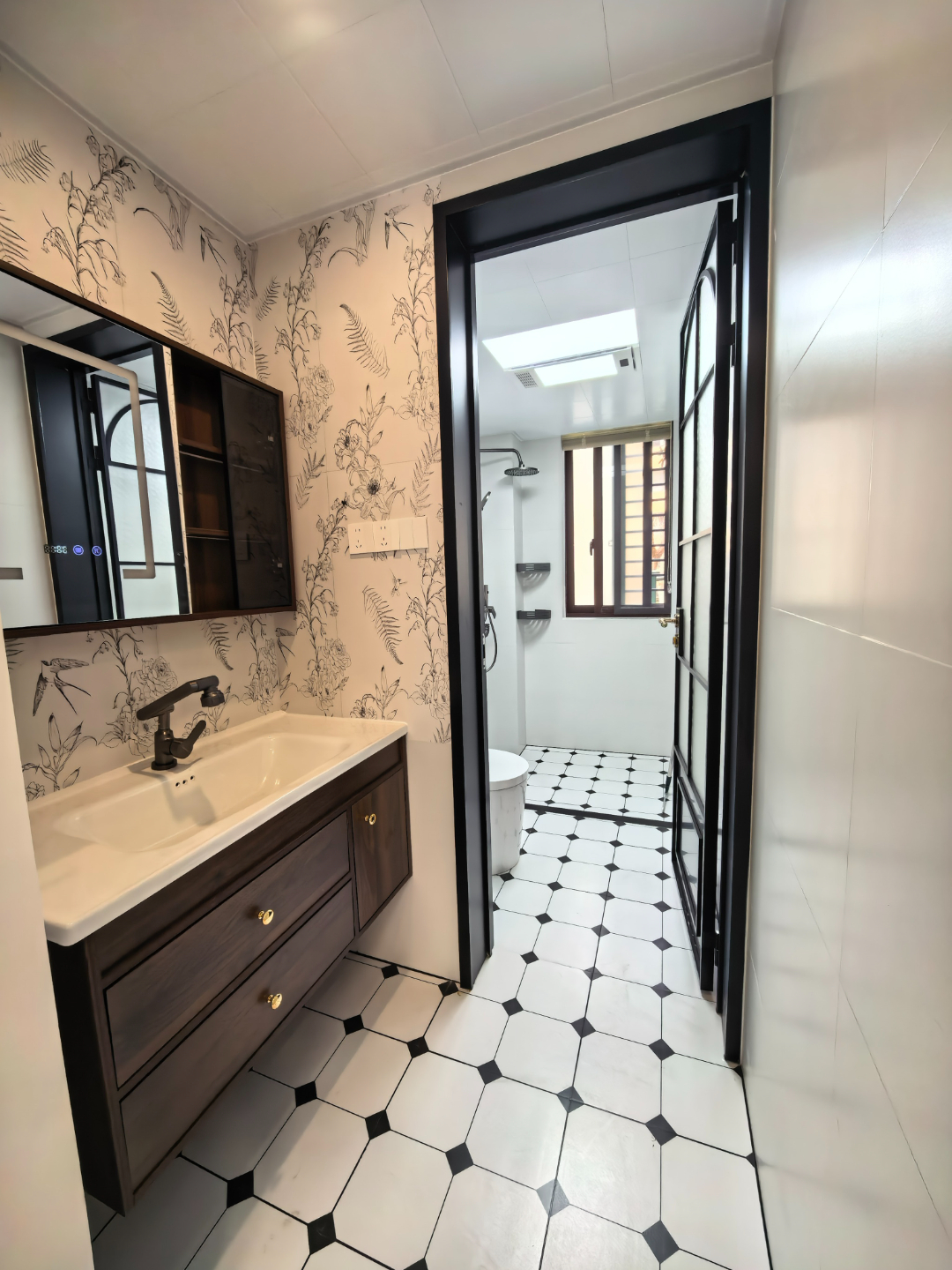 主卫还贴了复古花鸟壁纸,为简约的空间增添了一丝文艺气息,黑白花砖地面经典耐看,与全屋风格完美呼应。