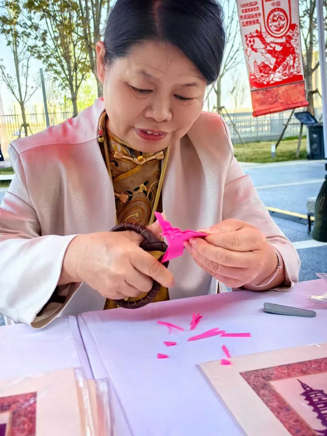 曹红老师现场展示剪纸创作技艺,指尖翻飞间,普通纸张便化作栩栩如生的图案,引得现场观众连连赞叹。不少足球爱好者停下脚步,近距离感受非遗魅力,在观赛之余体验传统文化之美,让这场国际足球赛事更添文化厚度。