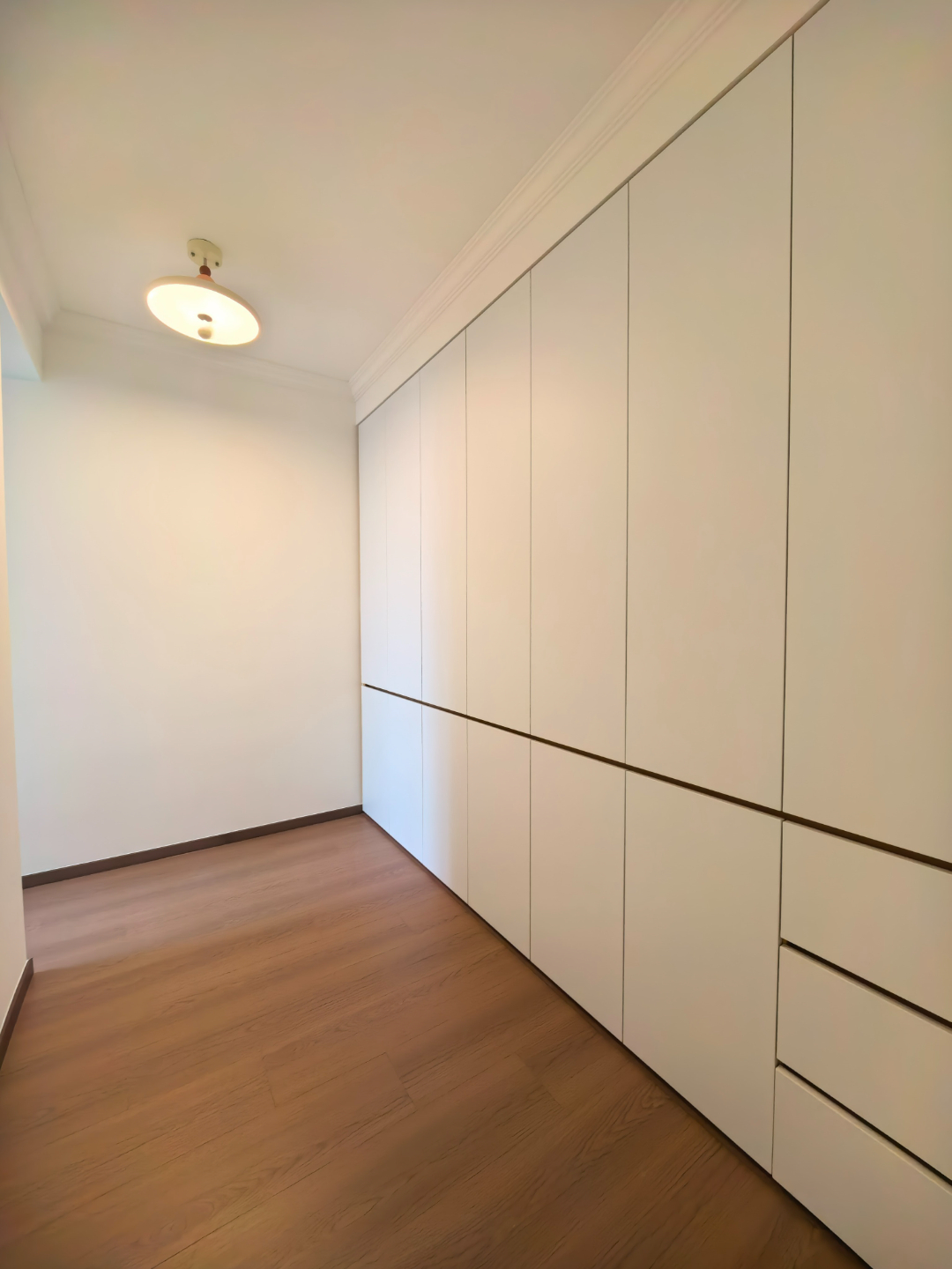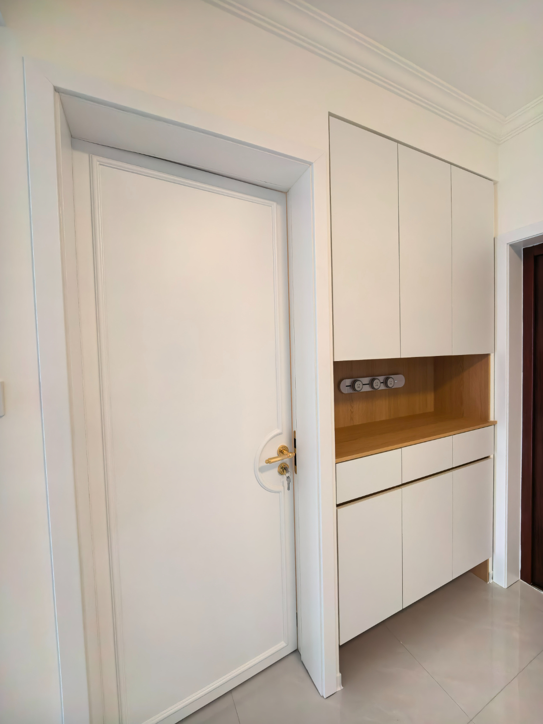 一进门就被这面到顶内嵌鞋柜狠狠拿捏了!整体白色柜门干净清爽,与全屋简欧风格保持统一,中间留空区刚好放钥匙、包包、快递等随手物品,不用额外摆放置物架,整洁又省心。底部悬空设计,日常换鞋不用弯腰,还能完美藏起拖鞋、扫地机器人,避免地面杂乱。最贴心的是中间留空处还做了一排轨道插座,后期不管是放香薰机,还是给手机充电,都能灵活调节位置,实用性直接拉满!