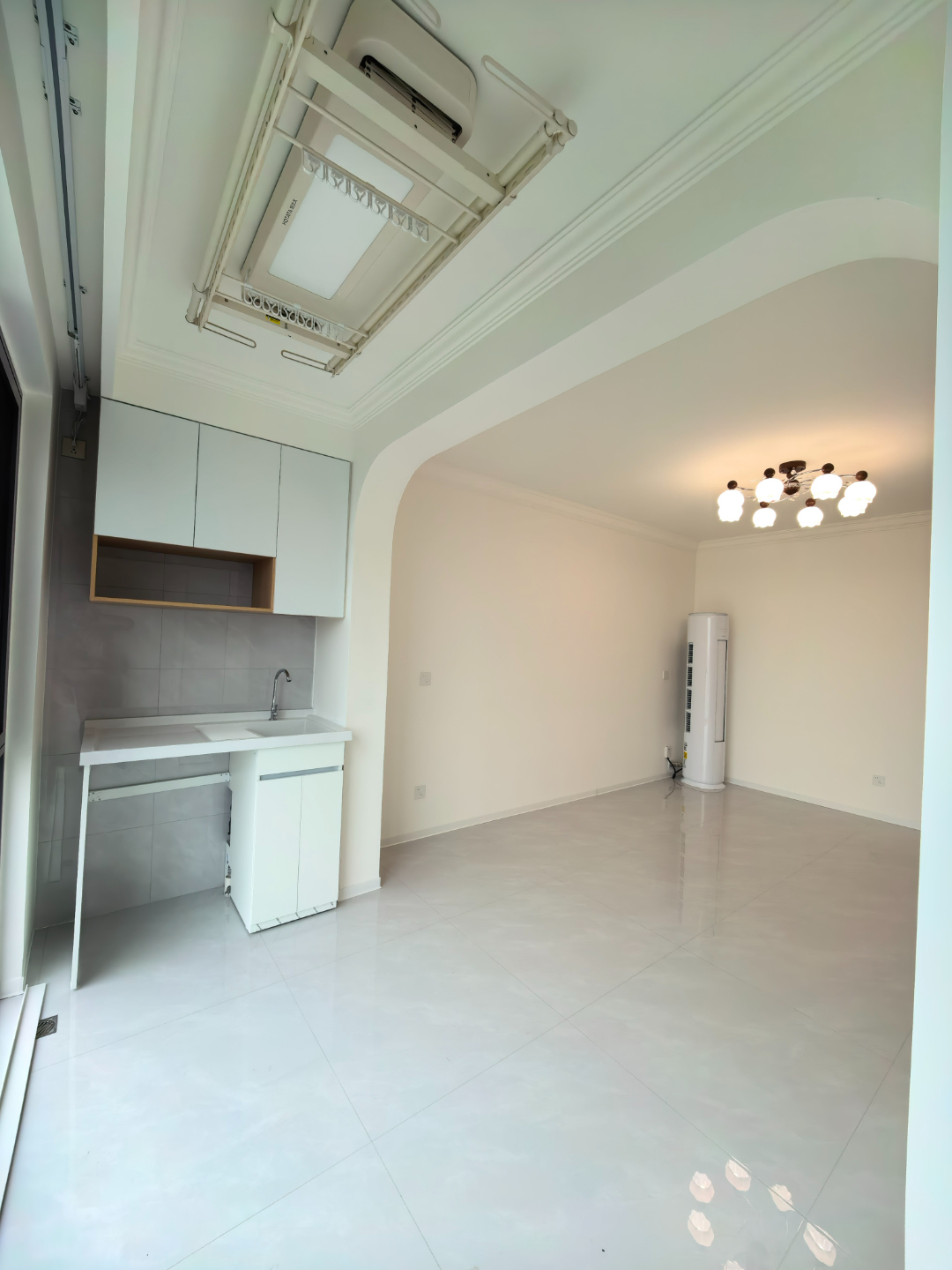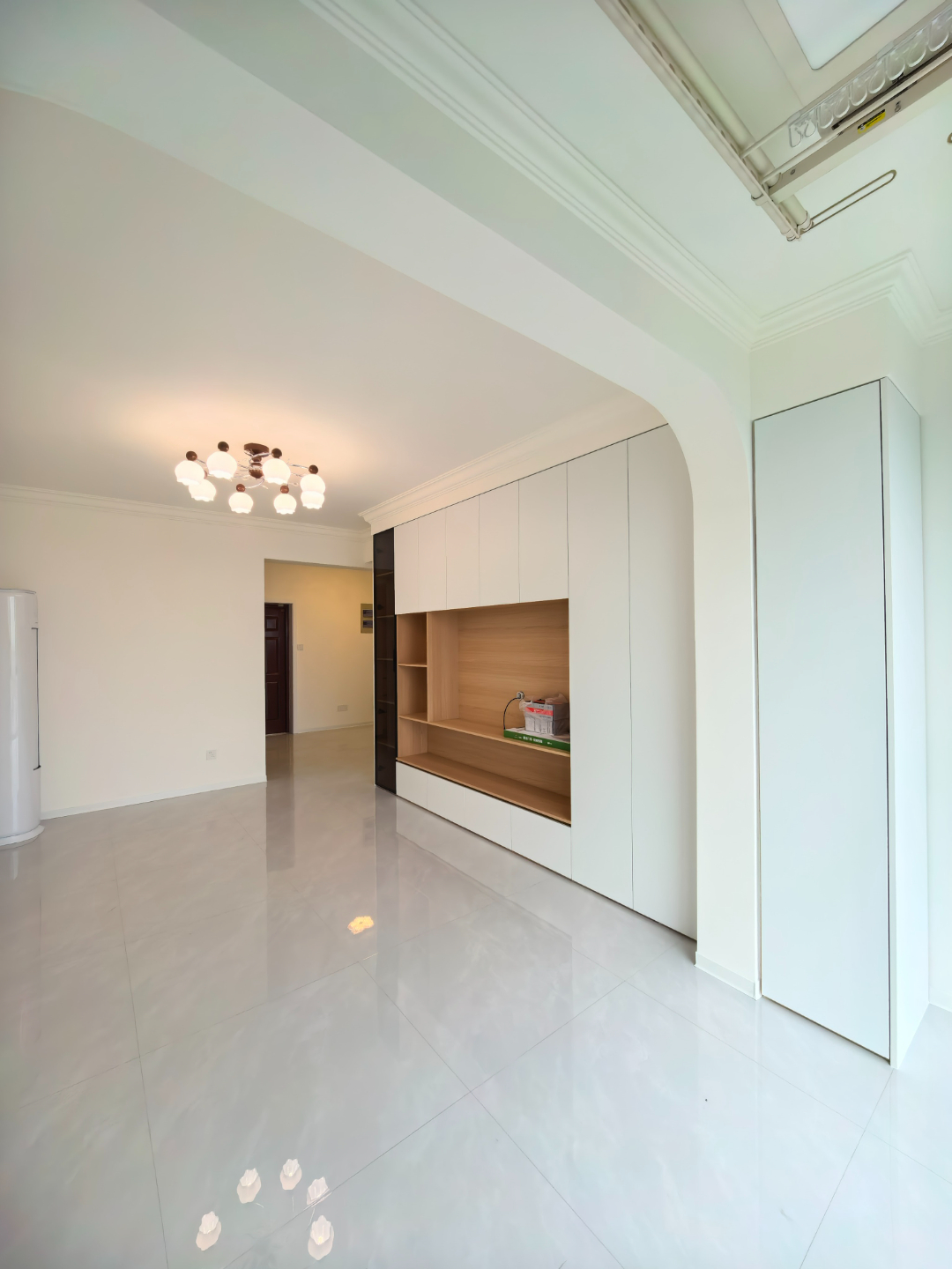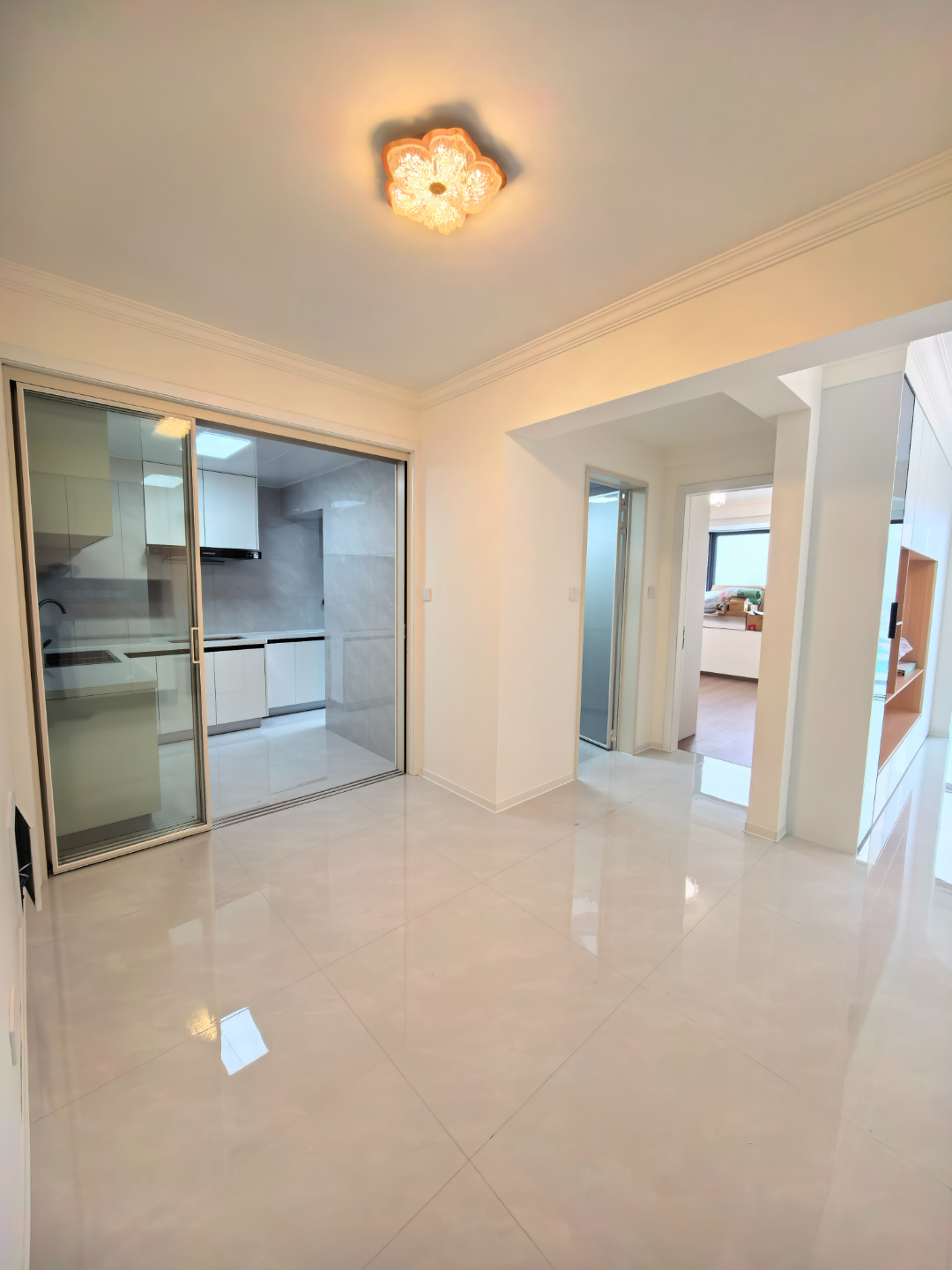 客厅通铺亮面大瓷砖,不仅打理起来方便,还能反射光线,让整个空间瞬间亮堂又显大,彻底摆脱小户型的压抑感。顶面没有做复杂吊顶,只走了一圈精致的石膏线,简约又大气,既节省预算,又能凸显简欧风的温柔质感。