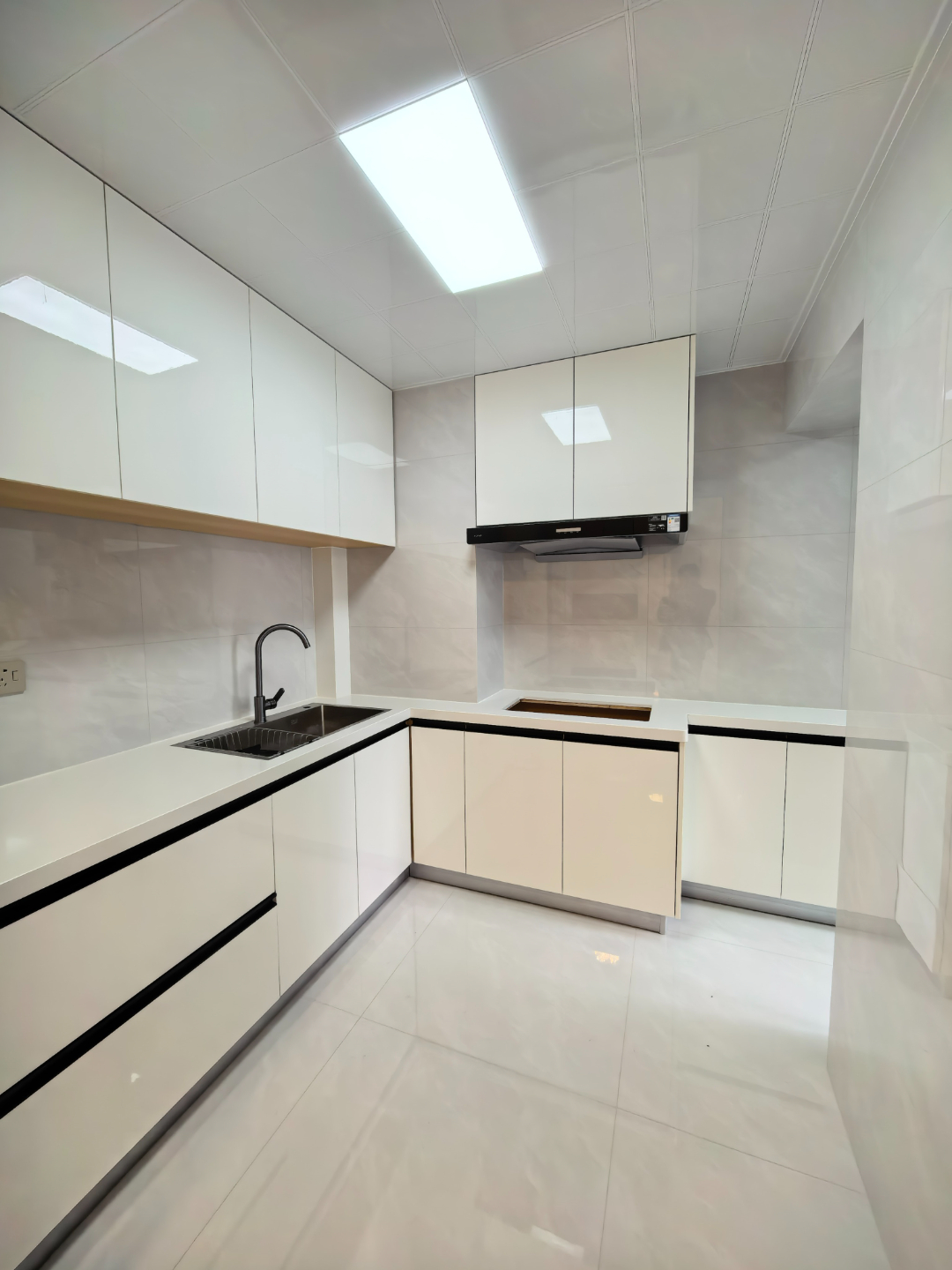 虽然这套房子的厨房是不规则户型,空间利用率看似不高,但结合户型特点,靠墙设计了一字型橱柜,完美适配不规则空间,不浪费每一寸面积。上下满墙吊柜,可以把锅碗瓢盆、粮油干货、餐具等全部藏起来。并且,还给厨房做了个三联动玻璃移门,相比传统移门,打开后能最大程度引入客厅的光线,让原本狭小的厨房再也不昏暗,通透感直接拉满,同时也能减少厨房油烟外溢,保持客餐厅的整洁。