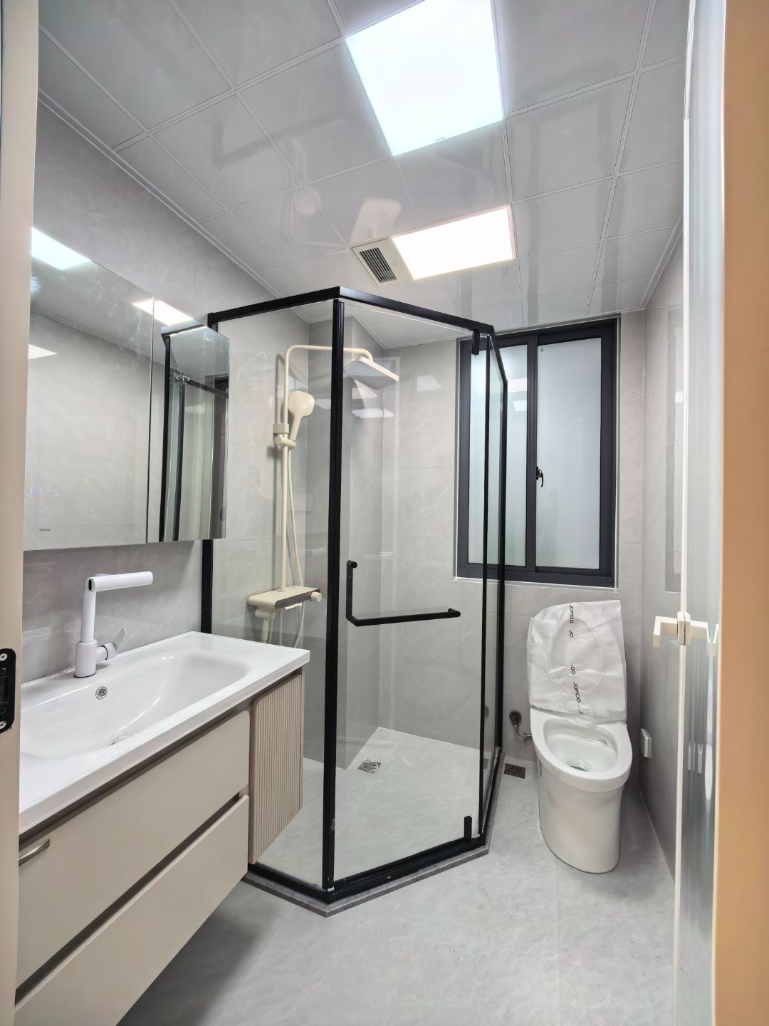 卫生间采用干湿分离设计,选择了钻石型淋浴间,相比传统方形淋浴间,更节省空间,完美适配小户型卫生间,同时能彻底实现干湿分离,打理起来也更方便。洗手台选用白色款式,搭配镜柜,收纳满分。而且这组白色系的洗手台与全屋简欧风格相呼应,温柔又显干净,提升卫生间的整体颜值。