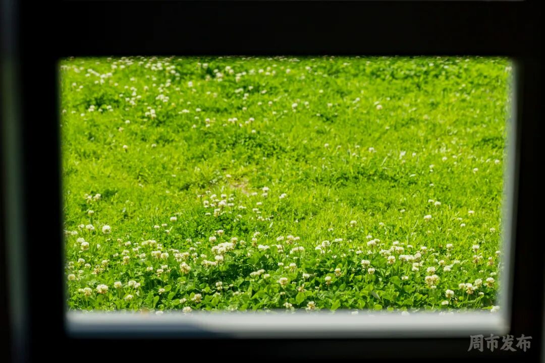 巧妙利用侨乡建筑标志性的拱门、拱窗作天然画框,将花草、树木、人物装入框中,营造景深感和故事美。身着素色(白、米、蓝)衣裙,置身油菜花海,人物作焦点,色彩层次更高级。