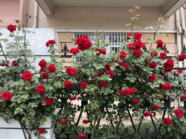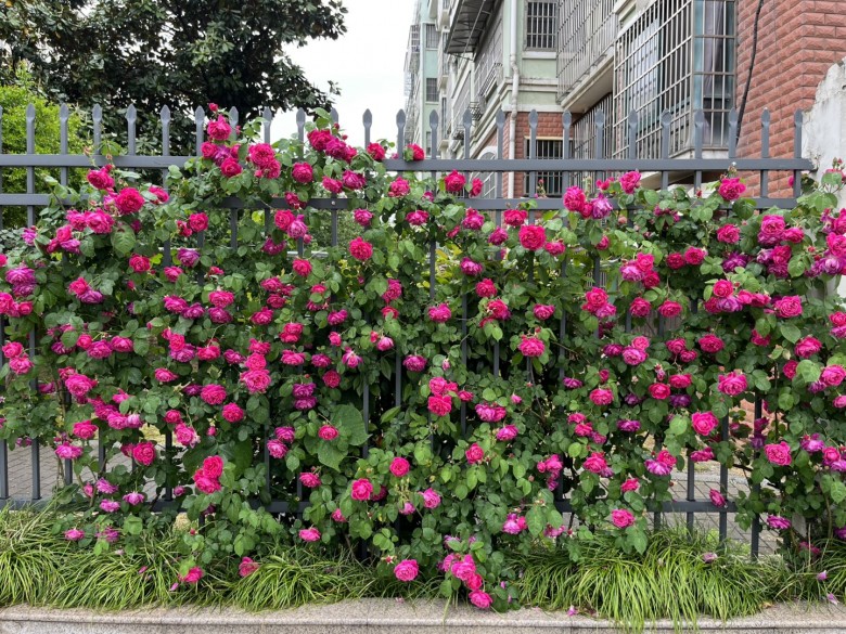 大开眼界,居然家门口就有个大花园!各种美丽的鲜花竞相开放,姹紫嫣红,我兴奋得举起手机不停的咔嚓咔嚓,一位五十岁左右的大姐热情地跟我打招呼,我问这是她种的花吗?真好看!她自豪地跟我说她用鸡肠做肥料,好多月季花枝上顶着好多花苞,大姐邀请我说,过几天花开得更多会更好看,你再来拍照。我居然没发现,那一整条的住户都种了很多花,整整齐齐的划分区域,一条龙的种着各种各样的鲜花,以月季居多。路过一户满院蔷薇盛开的小院,拱形的蔷薇花门,门前种了许多花草,男主人拎着一桶水出来浇花,我笑咪咪的看着花,女主人一脸不友善的样子,我偷偷问胖子为什么她要这样,胖子说大晚上的你拿着一个装快递的大袋子,人家以为你不怀好意,想偷她花。我故意提高嗓门跟胖子说:“天太黑了,我白天再来,”嘿嘿,吓死她,小样儿。