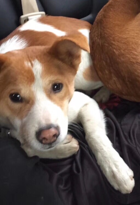 白色黄花的狗狗,八个多月,叫花花,脖子上蓝色项圈,有公安局发的狗牌