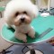 狗狗眼睛很大,眼边有泪腺,爪子全都修剪出来,身上剃了毛,头和耳朵尾巴毛没剃,带一个蓝色蝴蝶结马甲链,只有马甲没有链子!