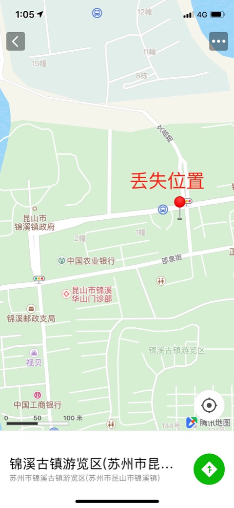 丢失地点: 昆山市锦溪古镇文昌路和普庆路路口附近。