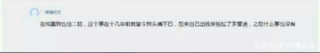 网友湖园庄主:在城里我也住二楼,这个事在十几年前就曾令我头痛不已,后来自己出钱单独拉了条管道,之后什么事也没有