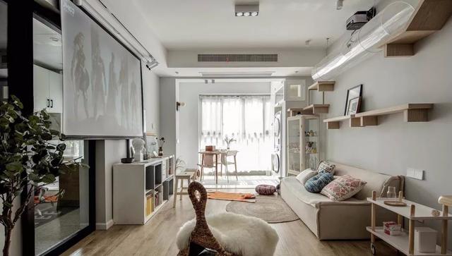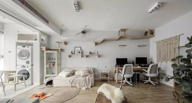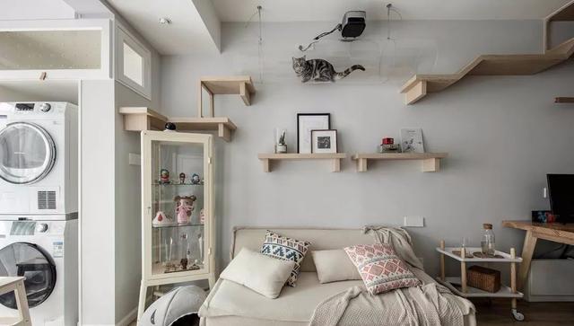 整个家里并没有电视机的需求,一套双座的懒人沙发+可开可合的投影足以满足们的观影需求,沙发的上空自然留给猫主子们上天遁地了。